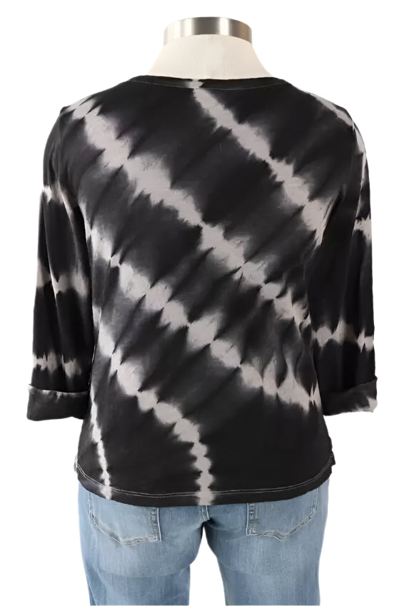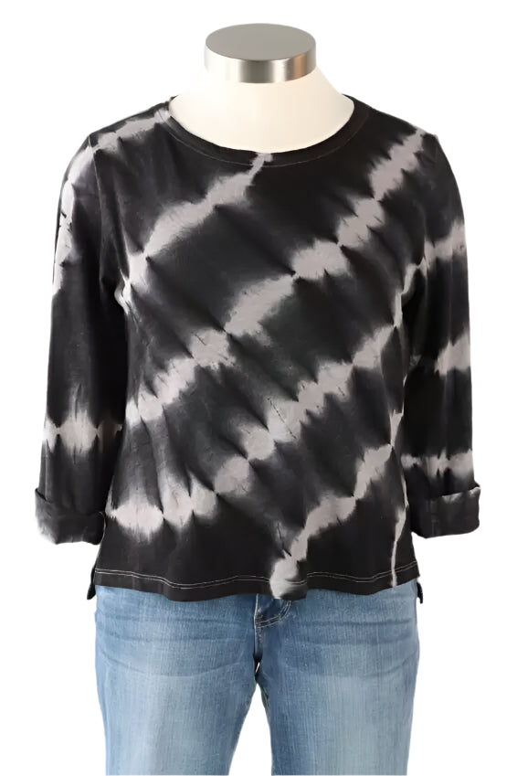 A sassy twist on a classic tee, the Stepped Hem Boxy Tee has a sporty slub texture and a high-low, side-split hemline that falls longest in back. It has a banded round neckline, full length sleeves and a laid back tie dye pattern that's set on the diagonal.