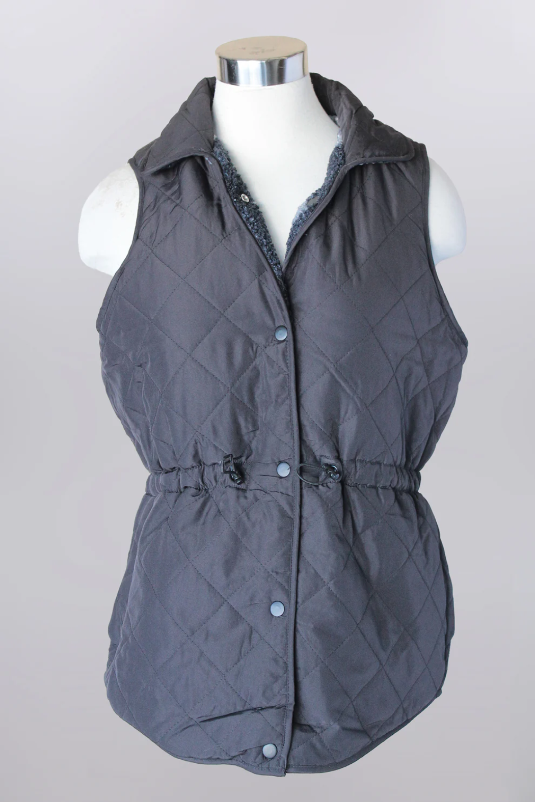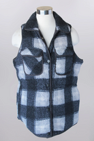 Make a statement with our charming Blue River Boucle Plaid Reversible Vest. Featuring a split neckline, snap-button front, dual breast pockets, adjustable side cinch gives you control over your silhouette, curved hemline, and mid-length cut. Best part - you get two vest in one! Flip it, style it, love it—versatility has never been this fun.