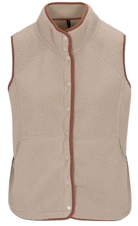 A Women's beige-colored vest with a brown collar. The vest appears to be made of a Pine Peak Short soft, textured fabric, overall design is simple and casual.