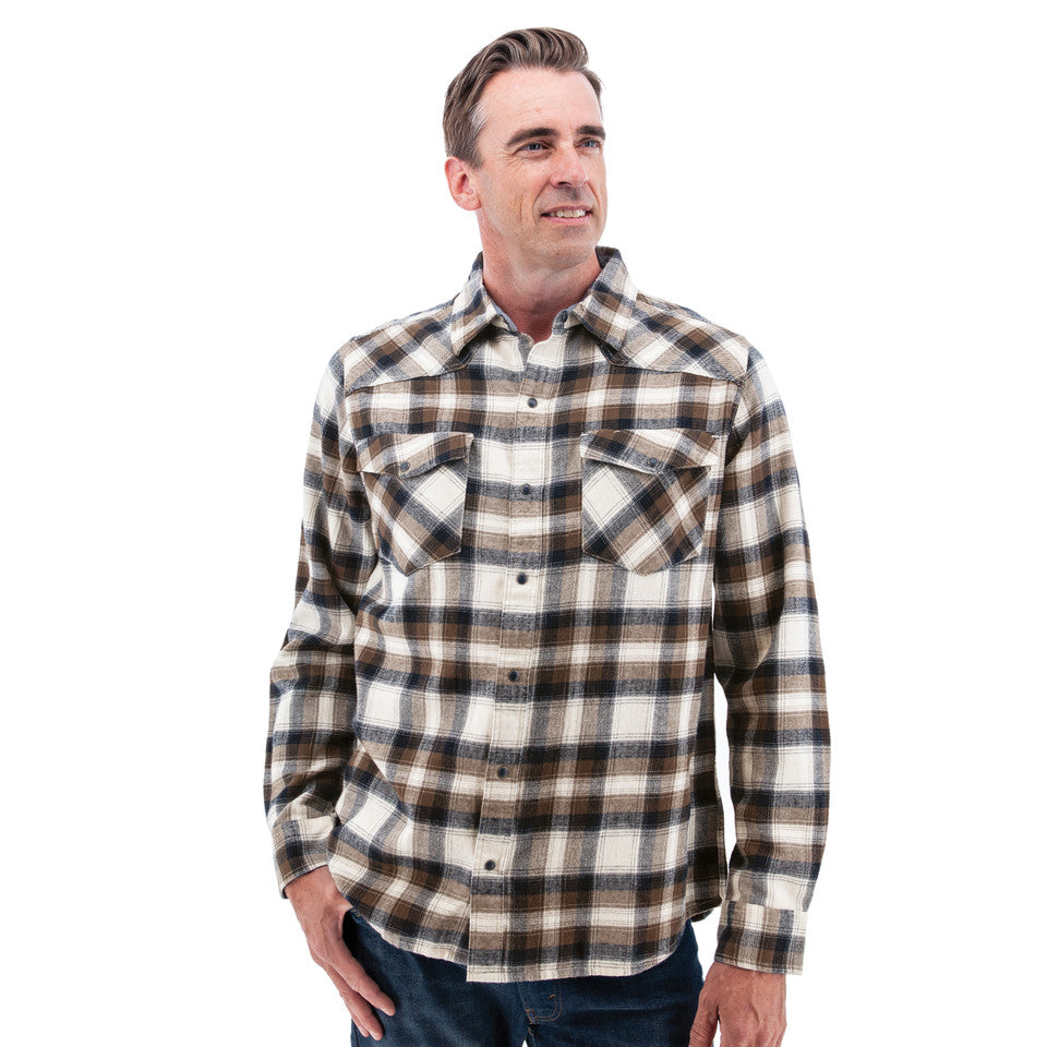 The best shirts are the ones you don't have to think about-the ones you reach for automatically because they just feel right, the ones that only get better with time. That's the Ranger Flannel Shirt. Made from 100% organic cotton and brushed for softness, it's got that already-broken-in feel, like an old favorite right from the start. The pearl snap closures and angled yokes give it a nod to classic Western style without trying too hard. Whether you're heading out on a cool morning, loading up the truck for a weekend away, or just throwing it on because it's the one that always feels right, the Ranger is is as dependable as they come.