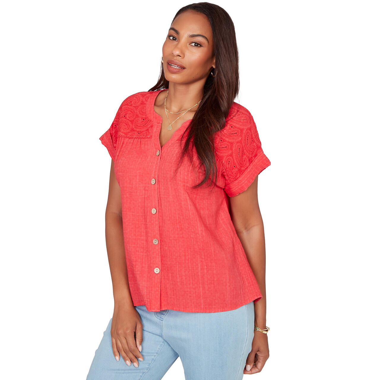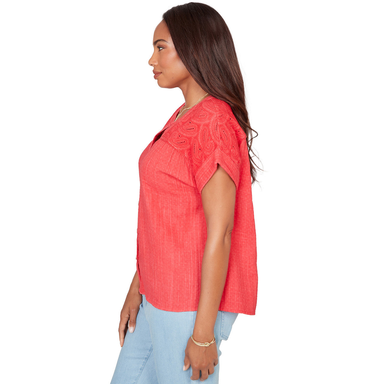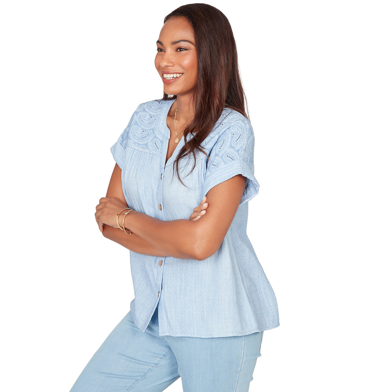 Women's Paisley Embroidered Gauze Button Tee - 76572