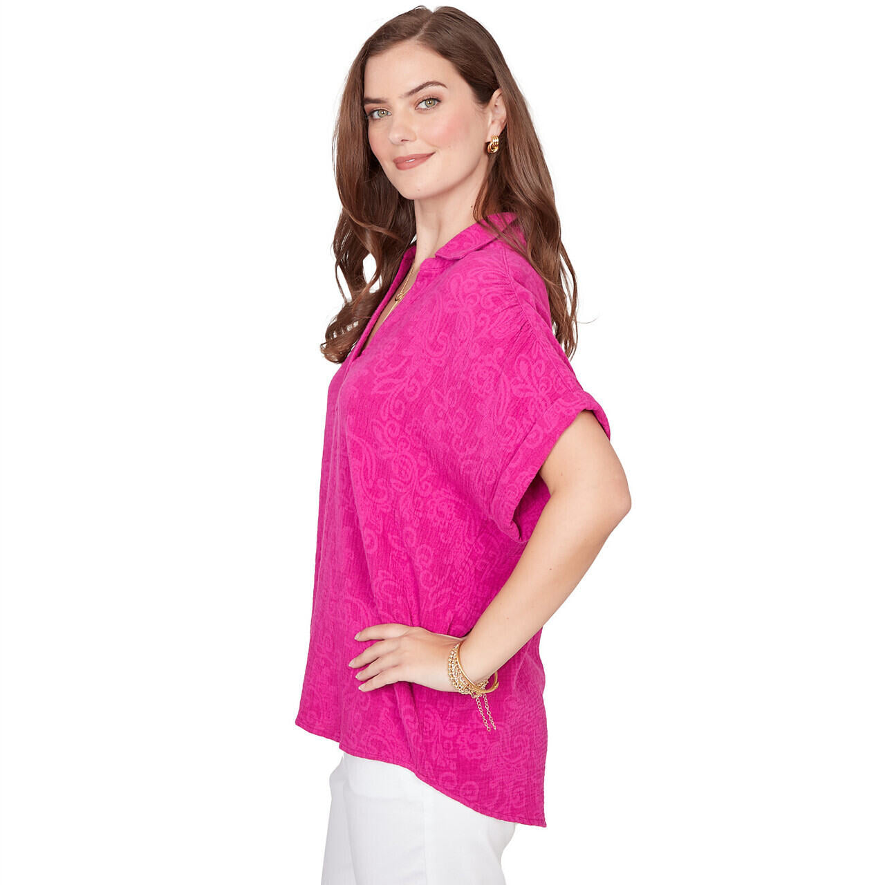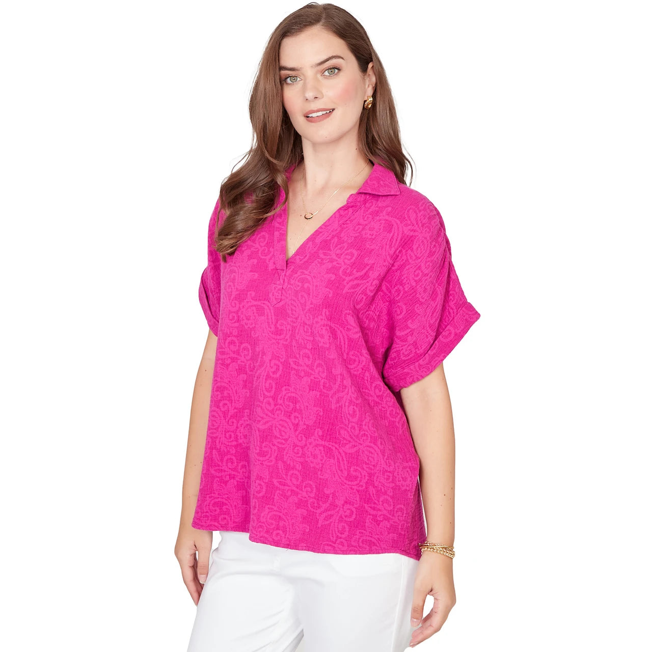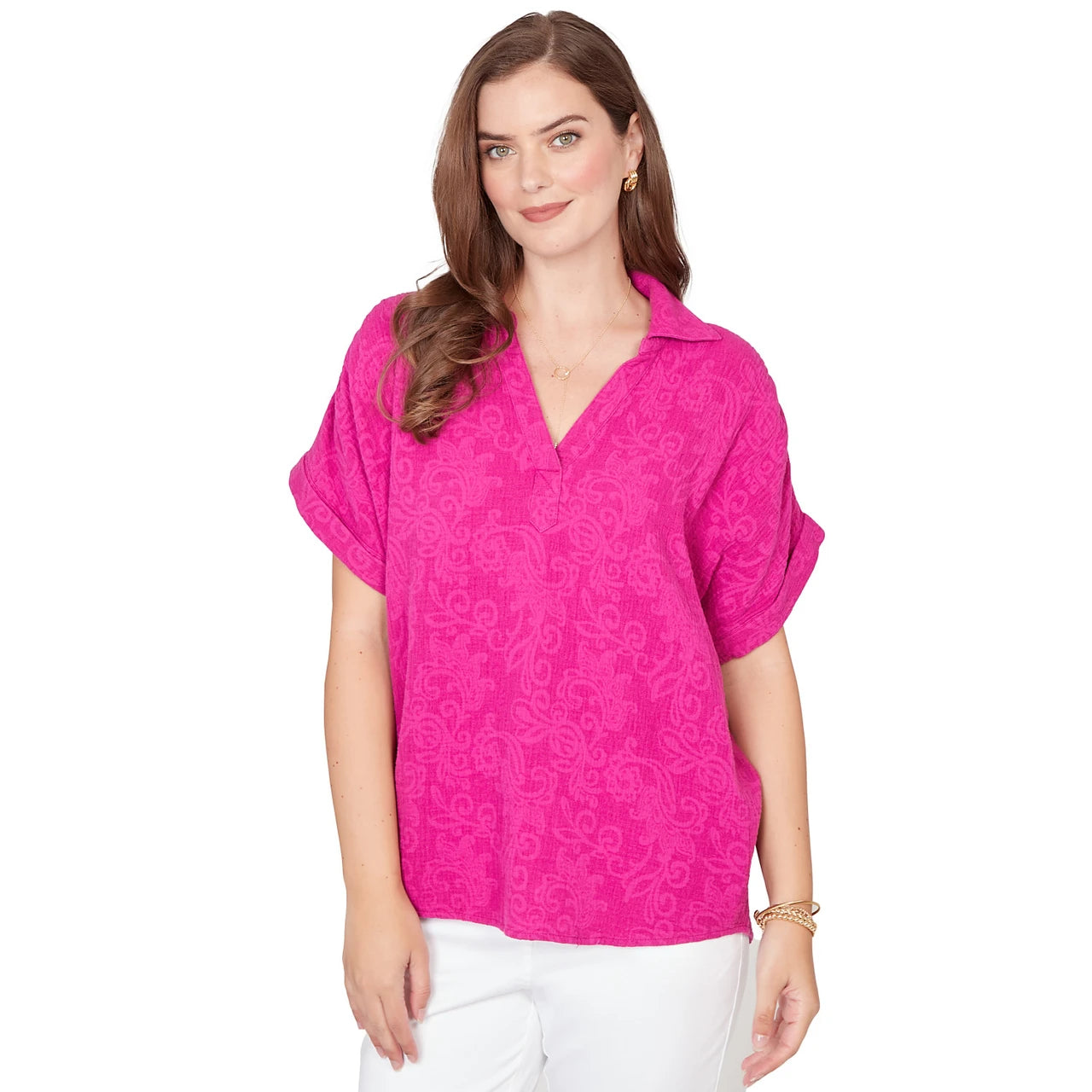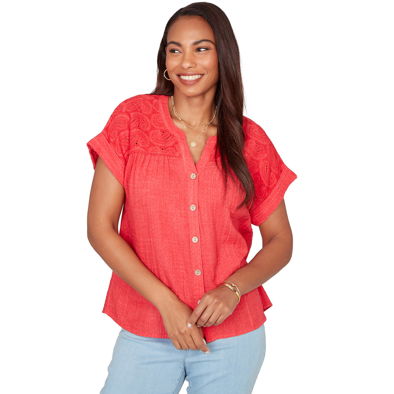 Women's Paisley Embroidered Gauze Button Tee - 76572
