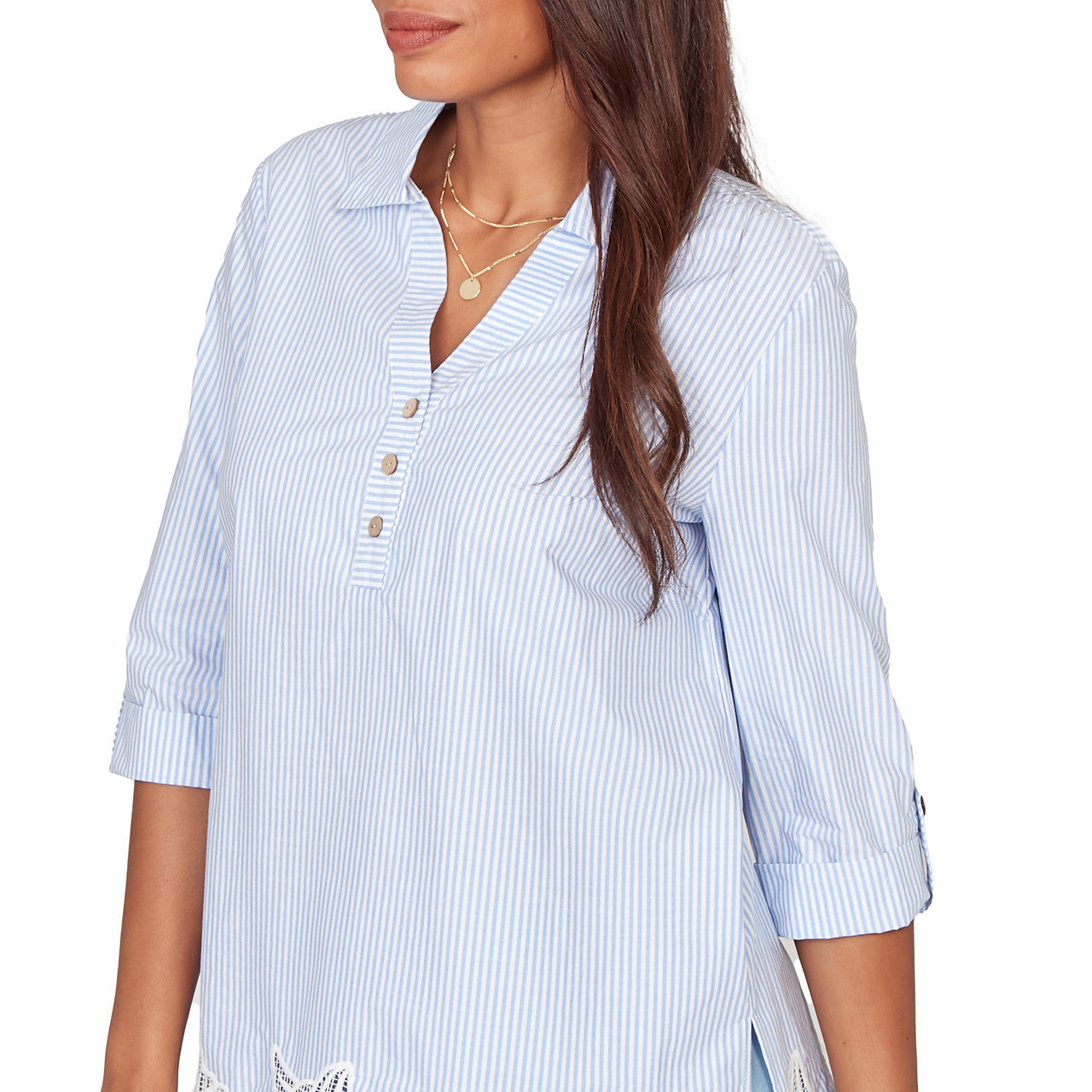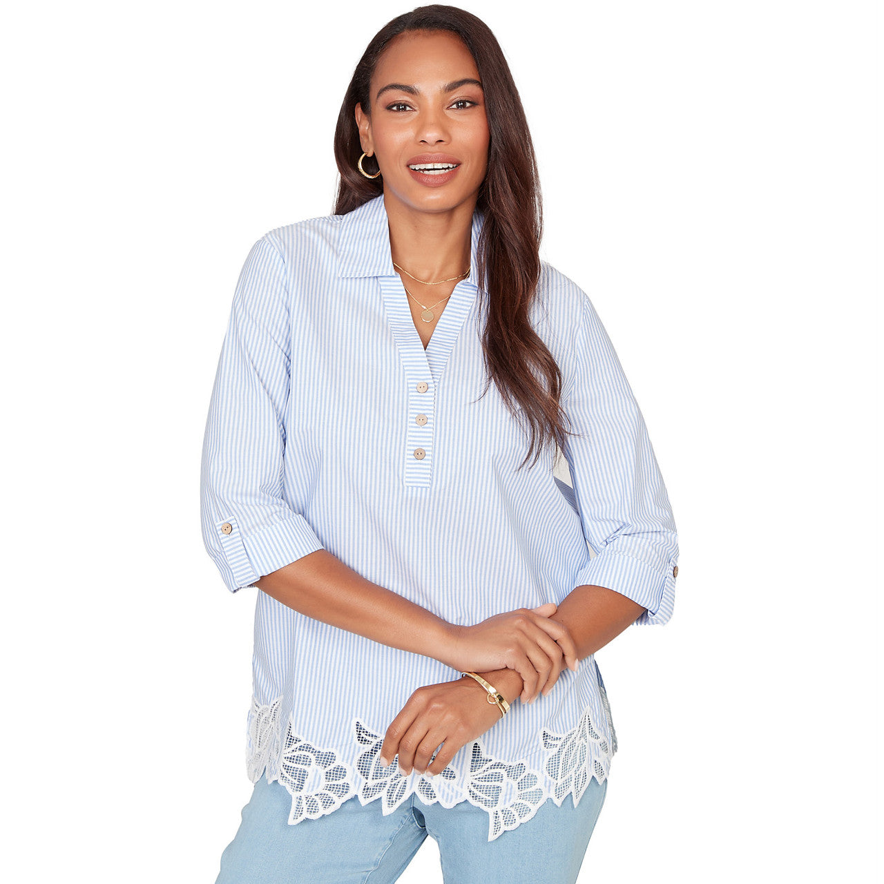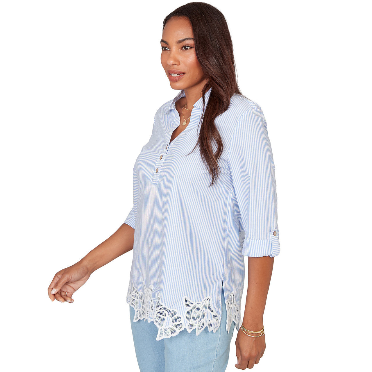 Women's Coastal Stripe Lace-Hem Henley Top - 76540