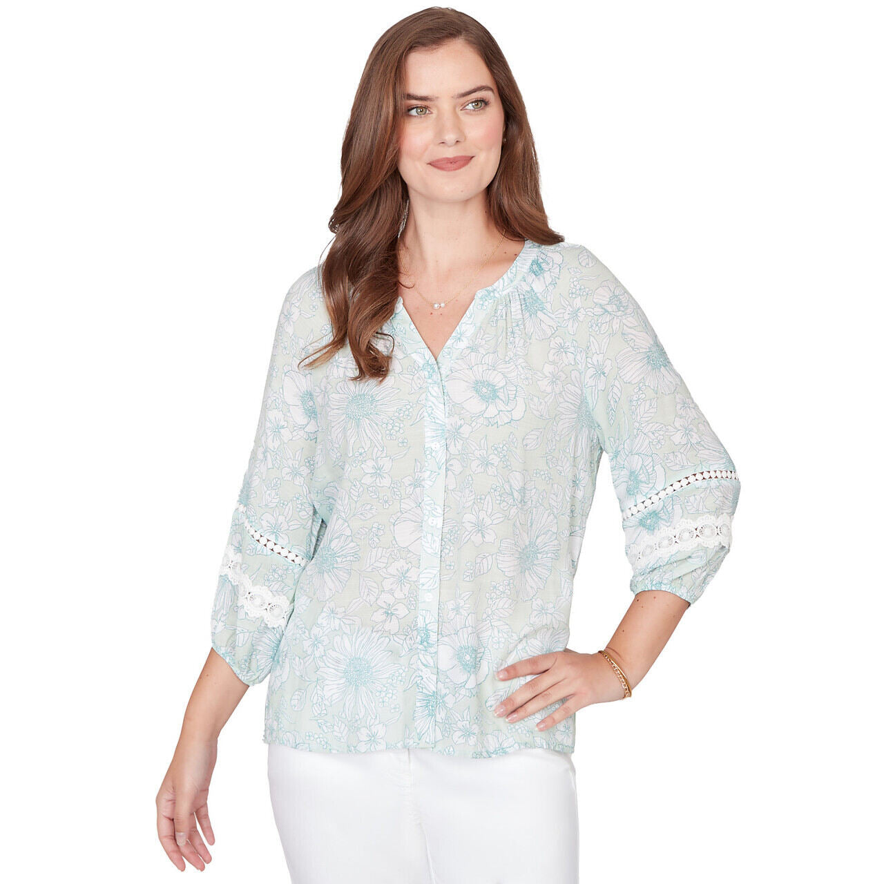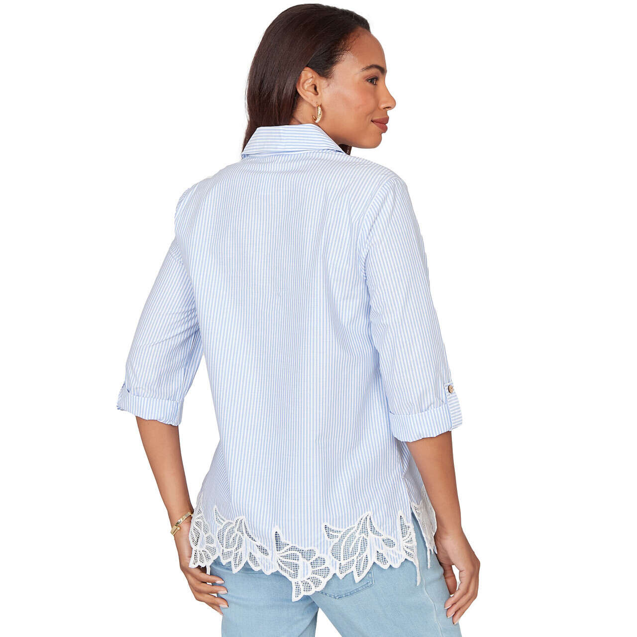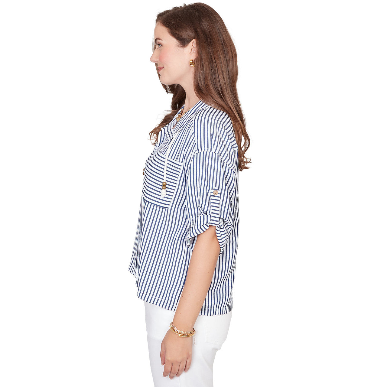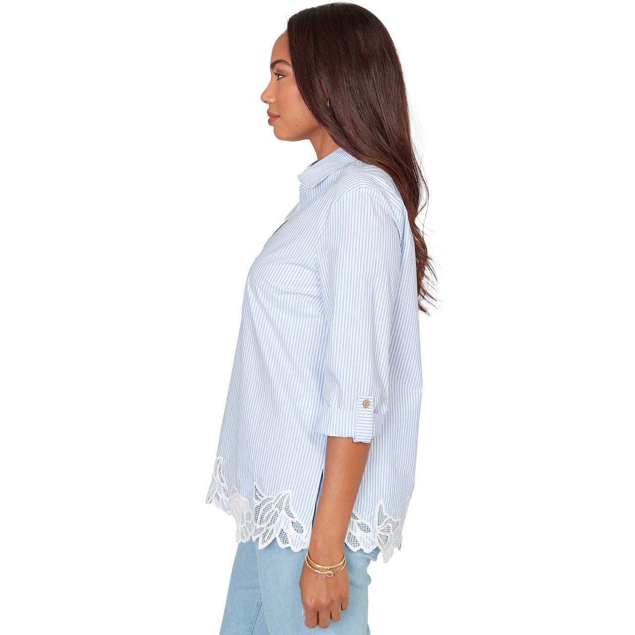 Women's Coastal Stripe Lace-Hem Henley Top - 76540