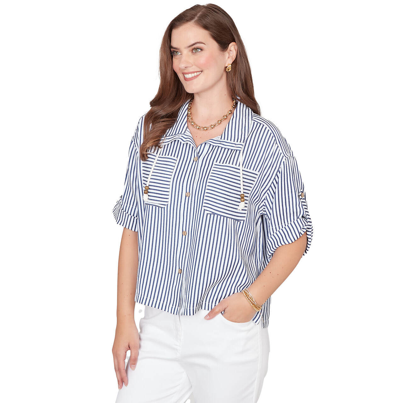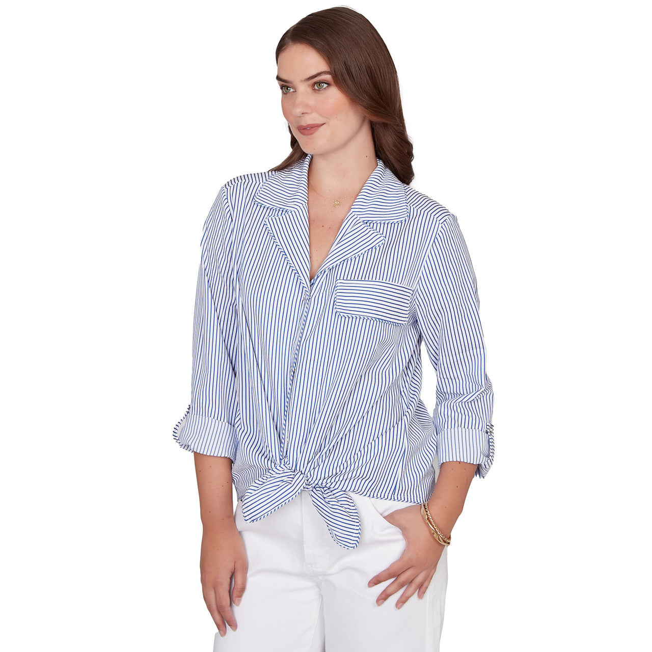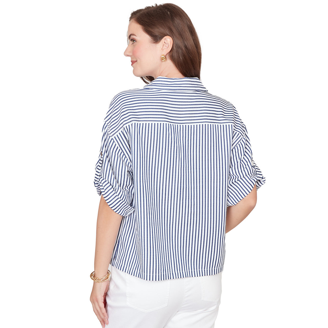 Women's Snap Front Tie Hem Pucker Stripe Top - 78441