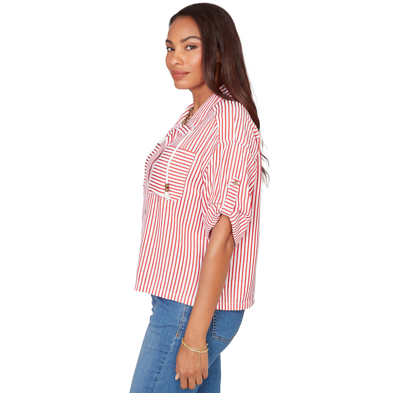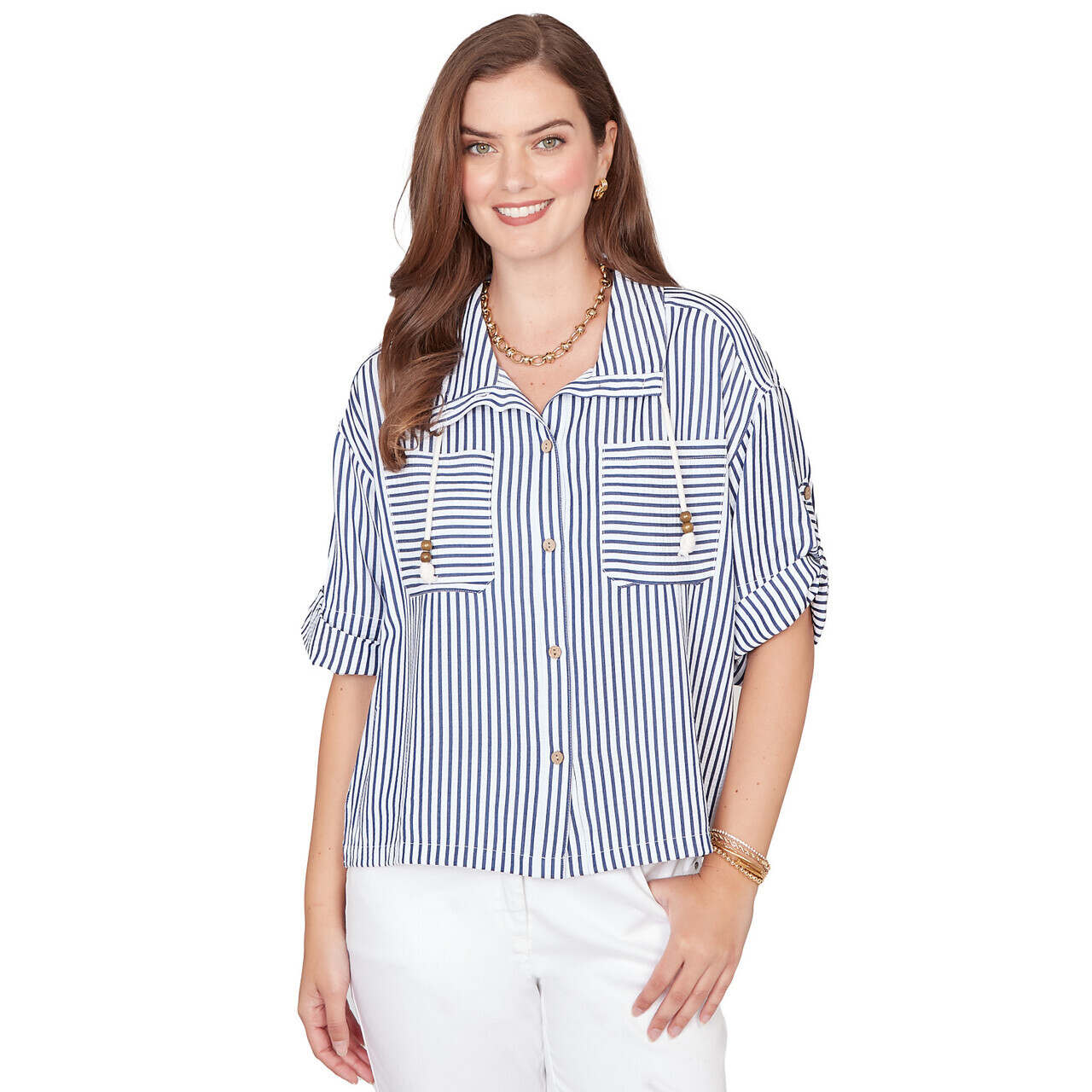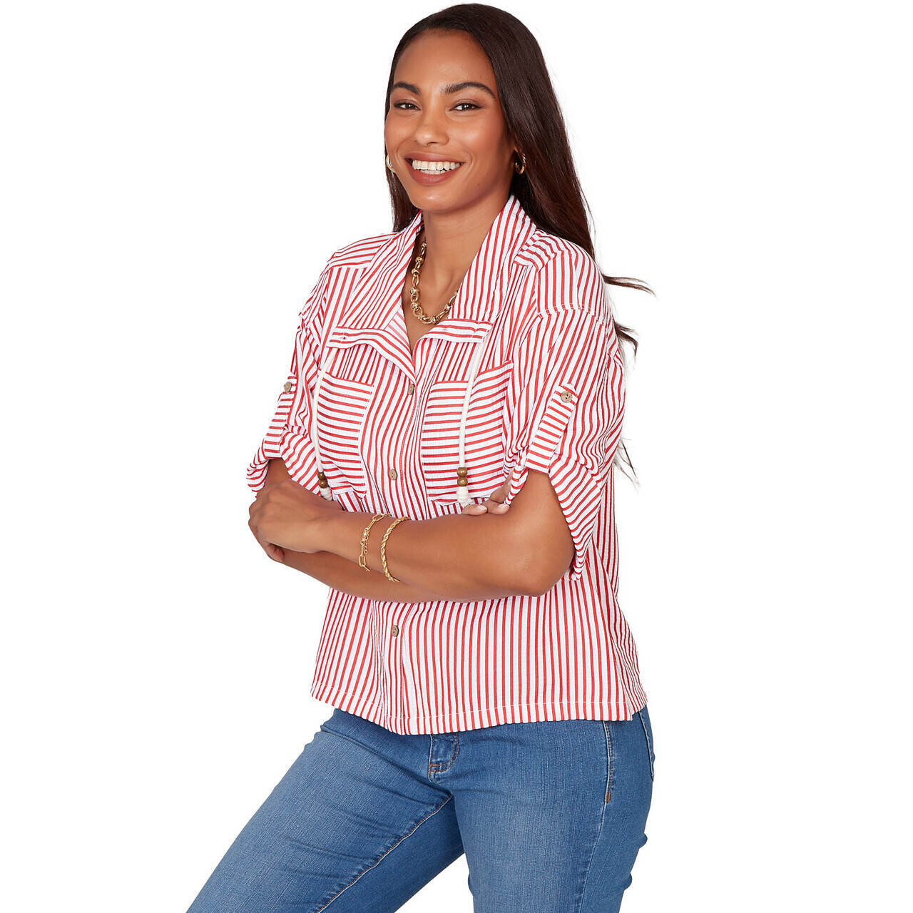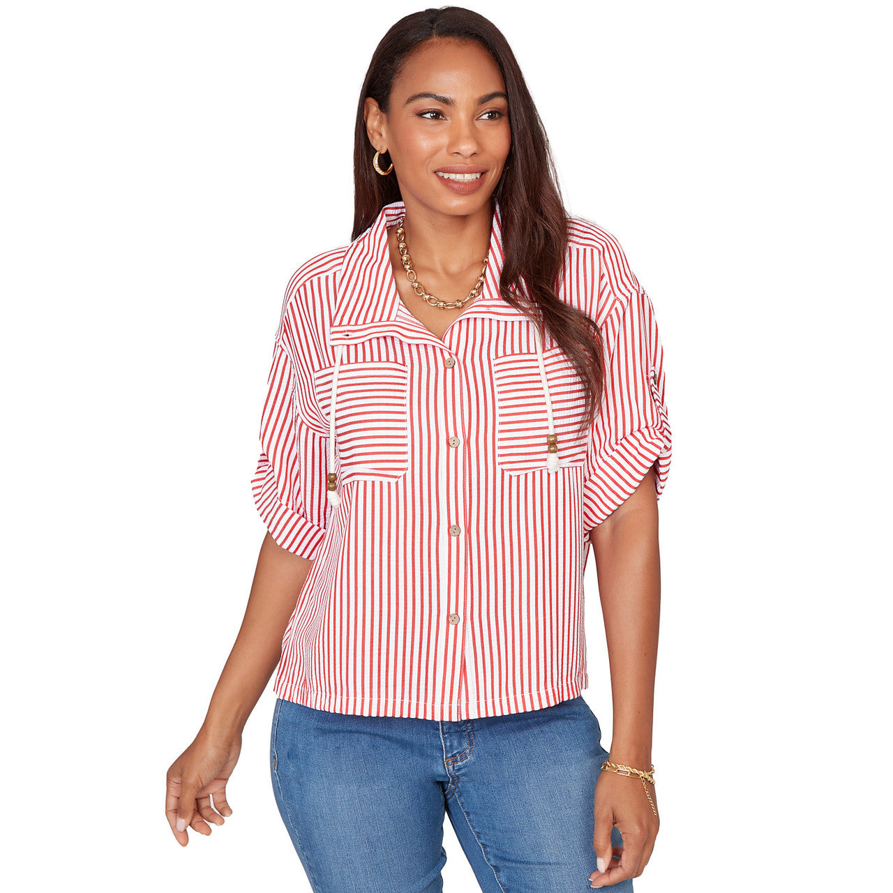 Women's Snap Front Tie Hem Pucker Stripe Top - 78441