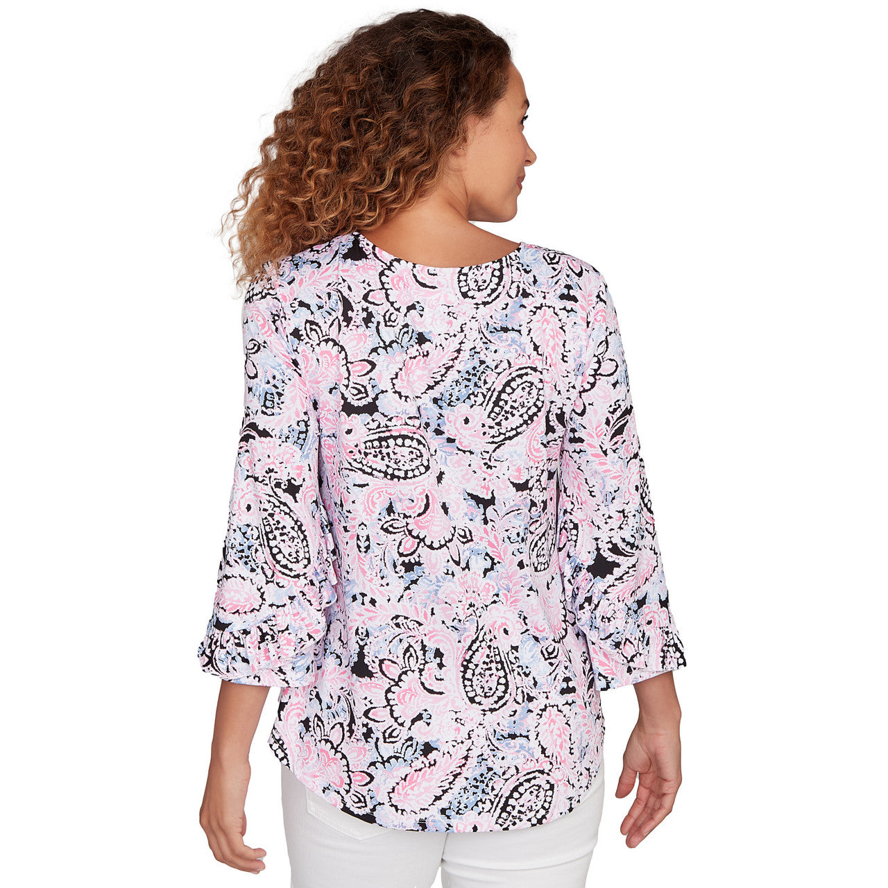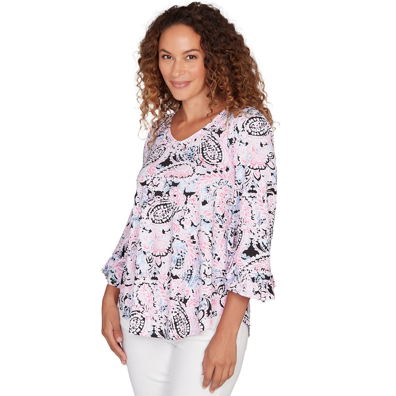 Women's V-Neck Paisley Ruffle Sleeve Knit Top - 81452