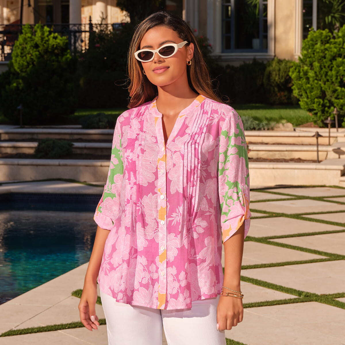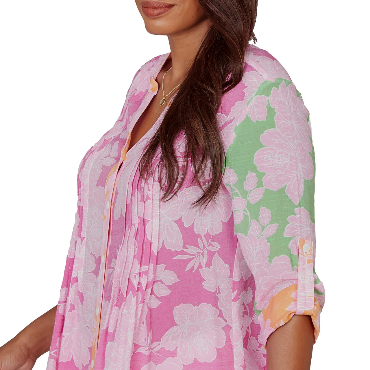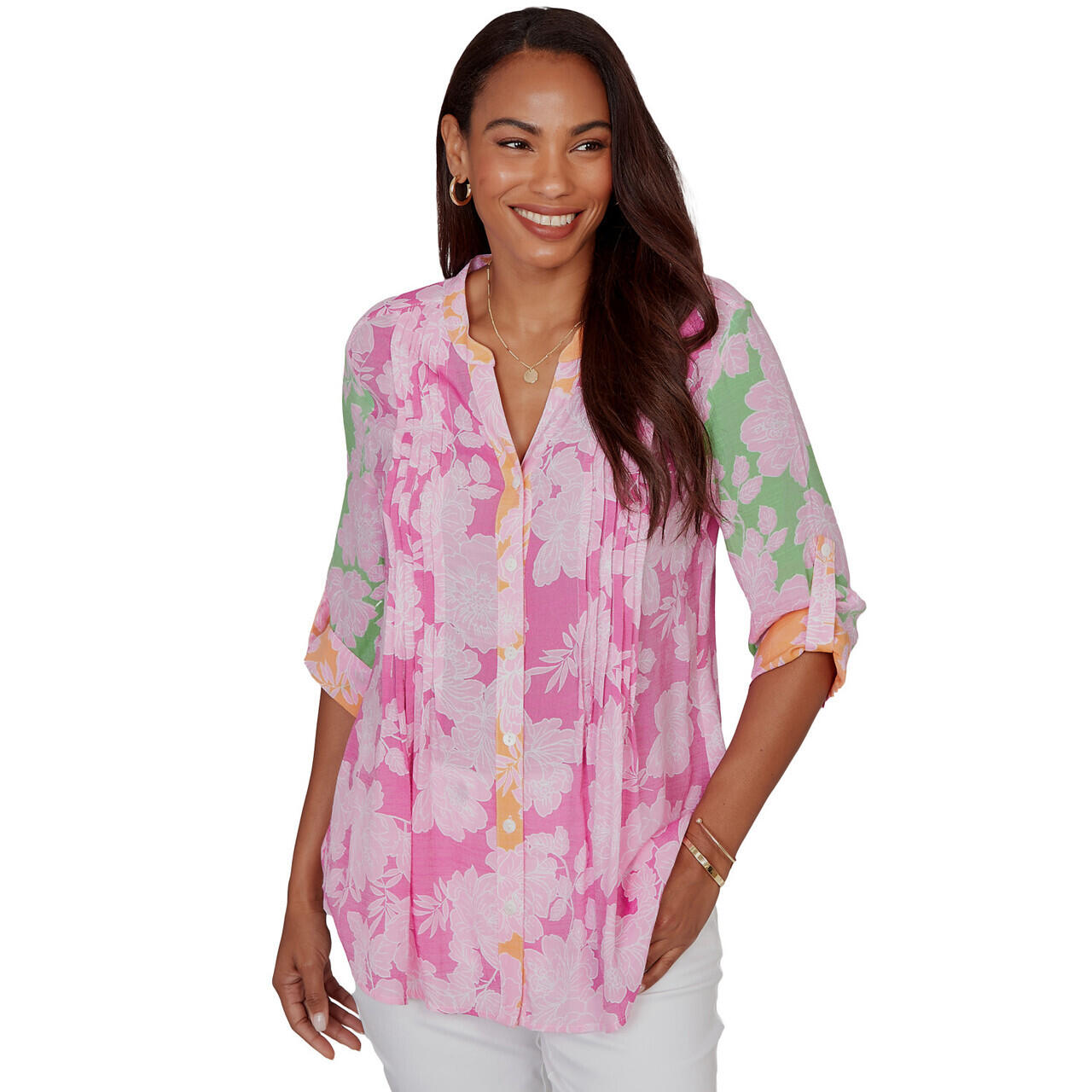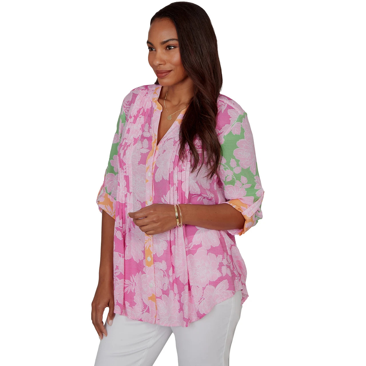 Women's Color Block Floral Pintuck Gauze Blouse - 75547