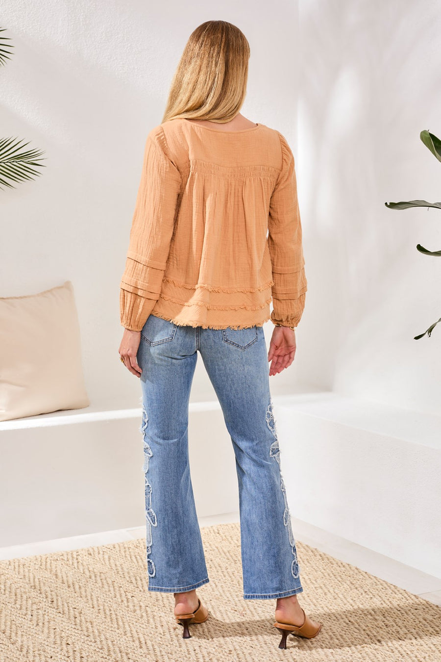 Crinkle Gauze Button-Front Balloon Sleeve Frayed Hem Blouse - Sahara Beige - 61650-4555