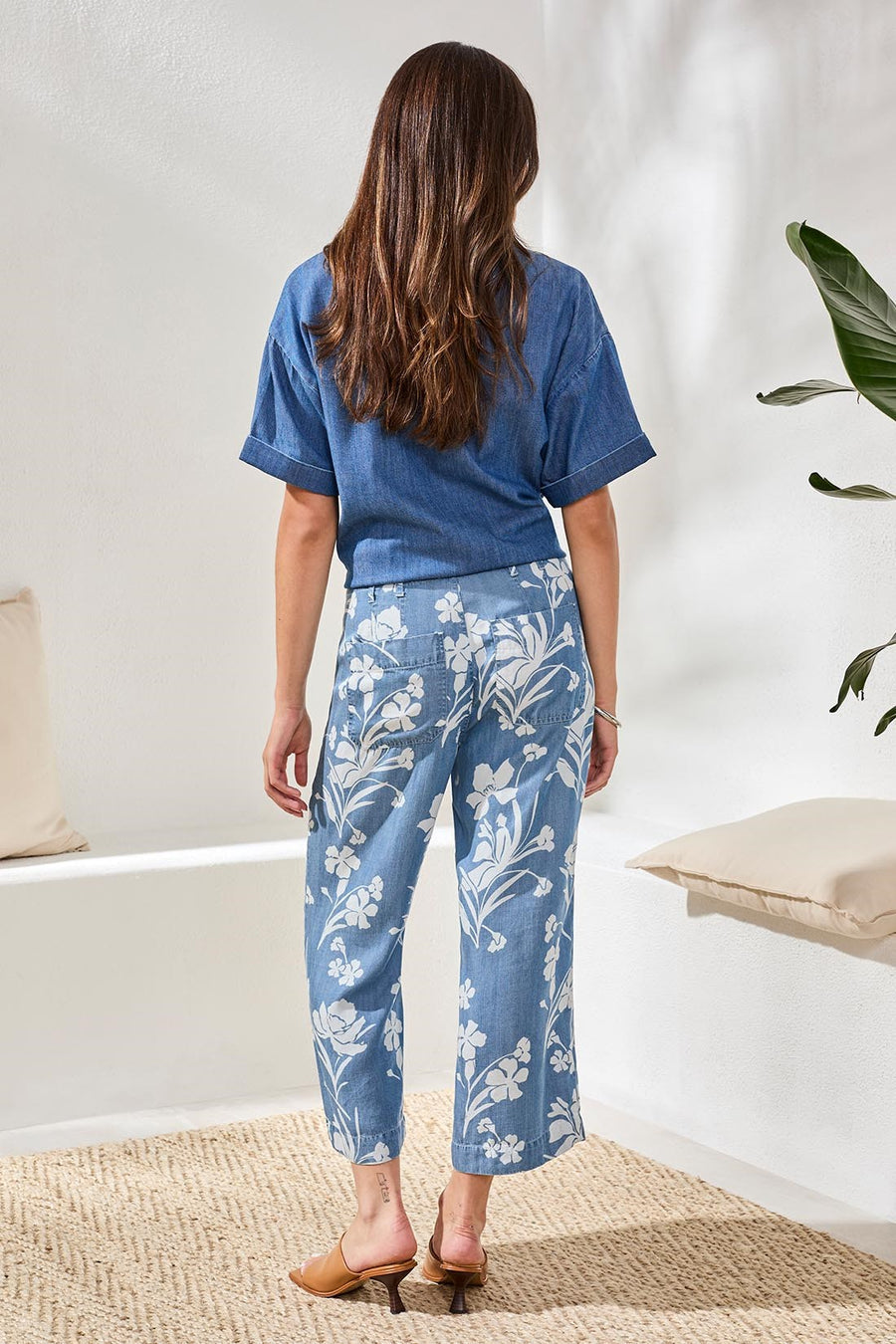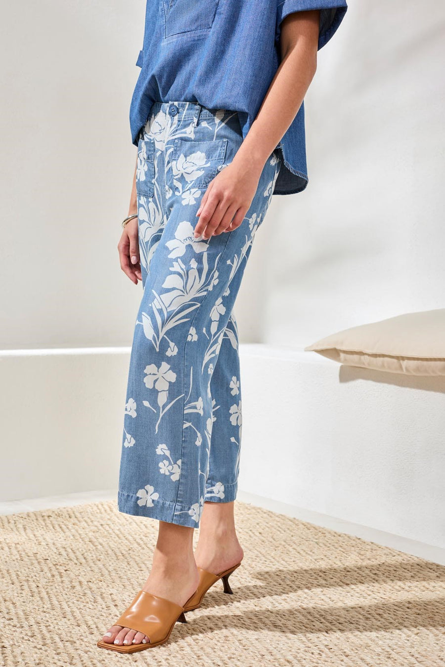 Drape Denim Printed Wide Leg Button At Waist Pants - Seaside Blue - 61420-4954P