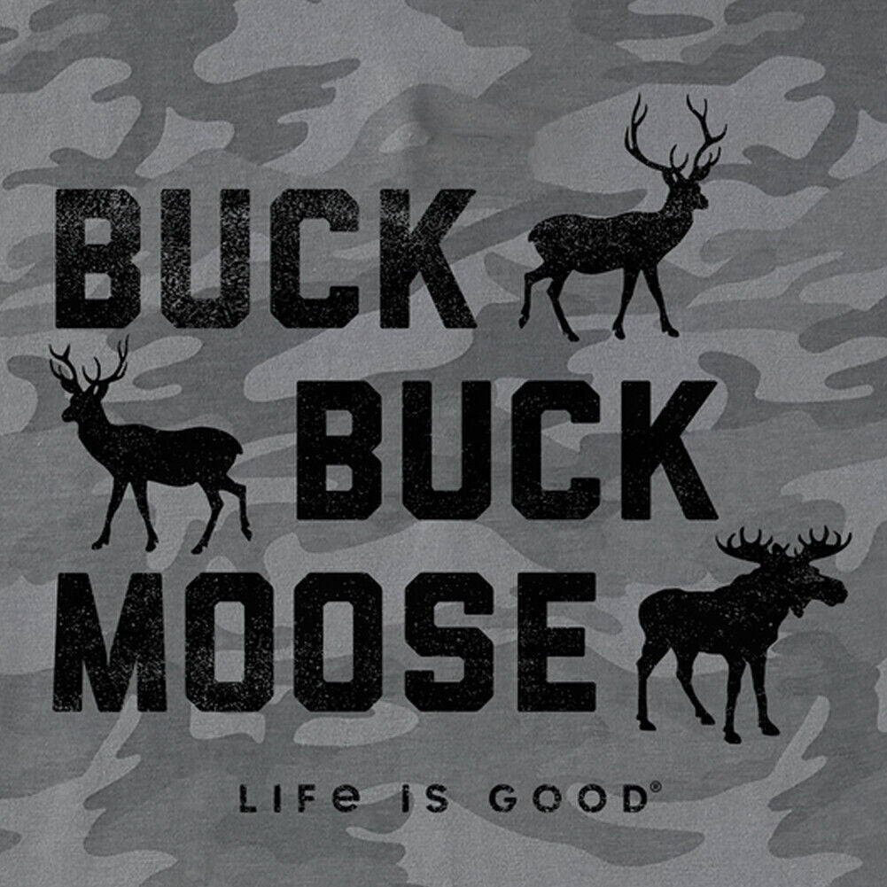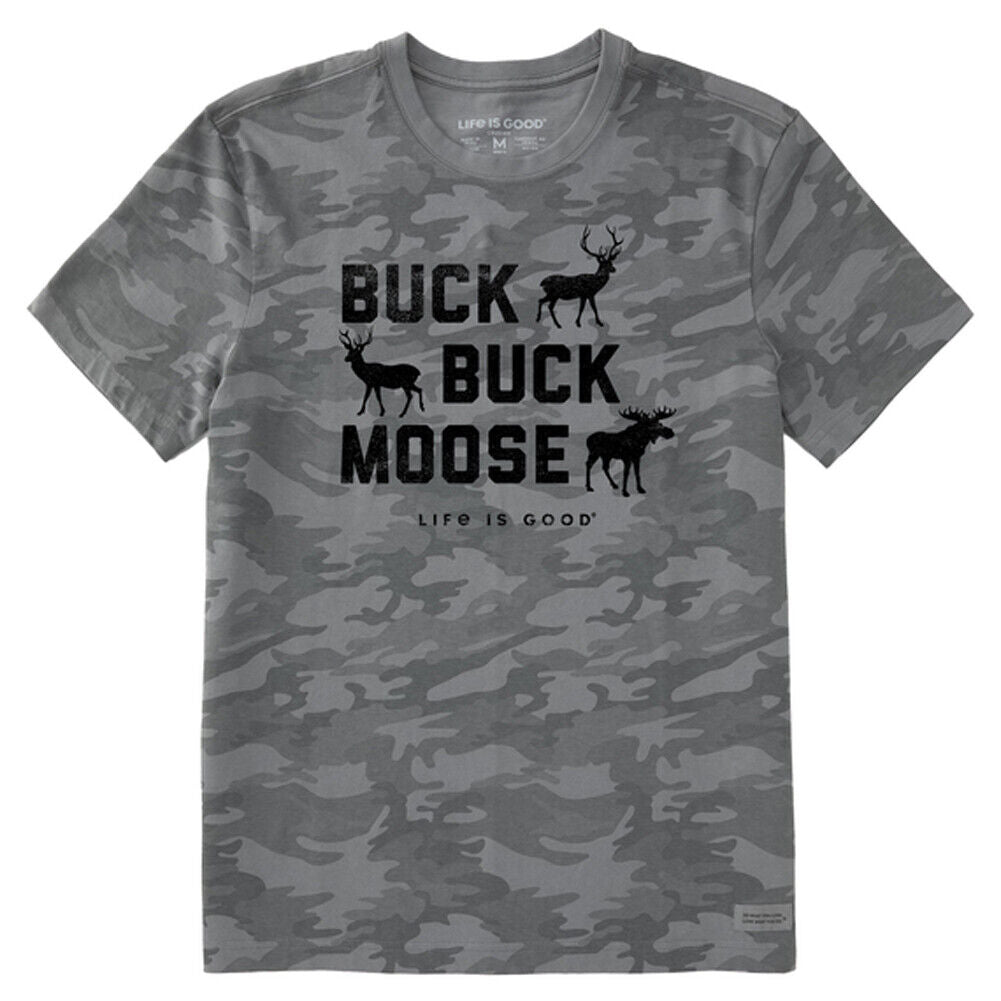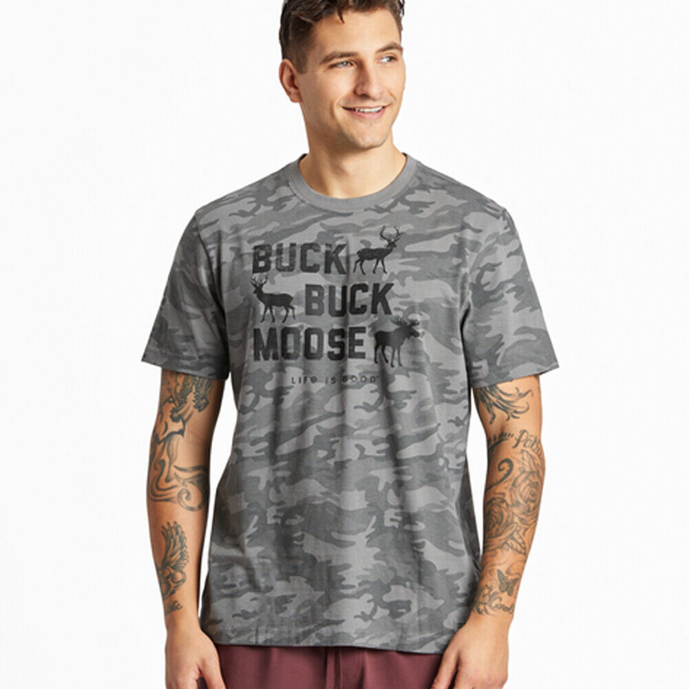 Life is Good Men's Buck Buck Moose Allover Printed Crusher Tee for those who love a rugged look, LIG Men’s Short Sleeve Allover Print Crusher Tee has you covered with a subtle grayscale camo pattern fully printed on the front, back, and sleeves.