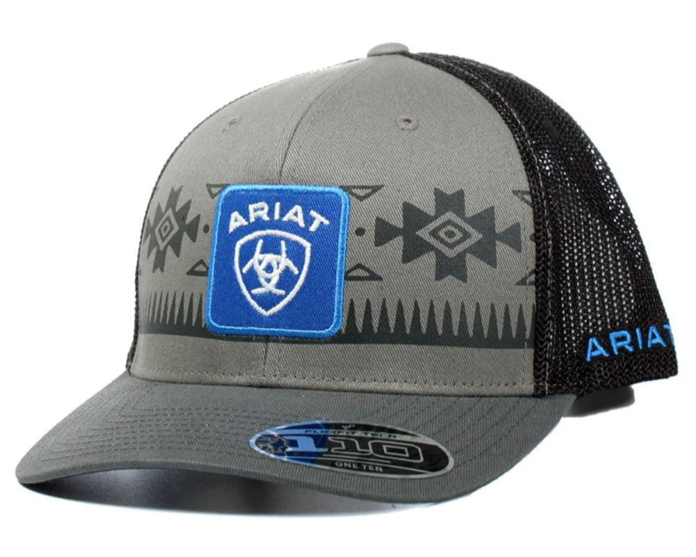 Ariat A300064806 Flexfit 110 Snap Back Southwestern Shield Cap Grey - Front two panels and bill are grey with a southwest design on the panels. Black mesh back with snap back closure.