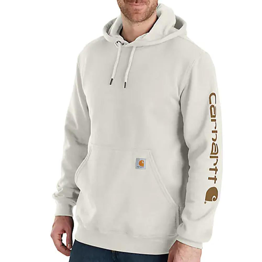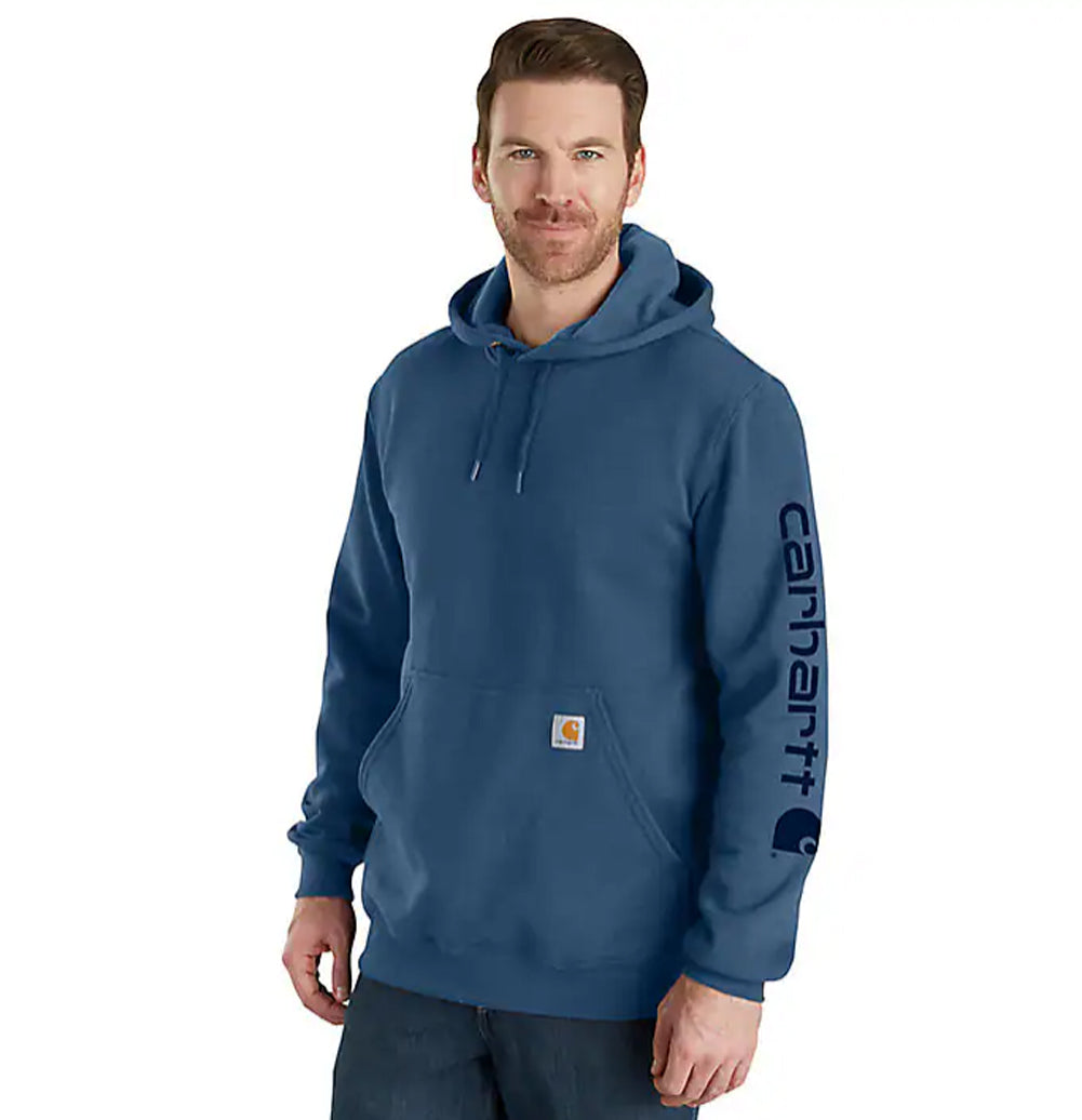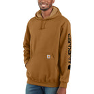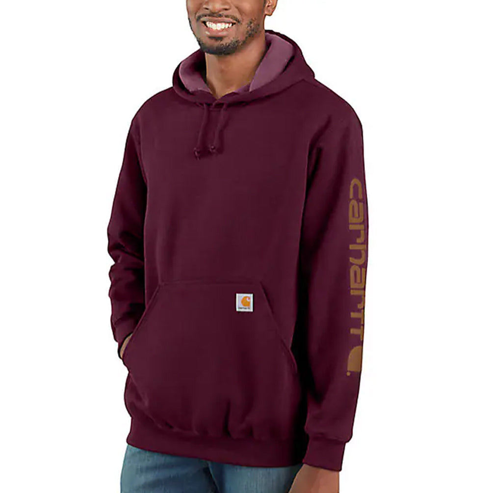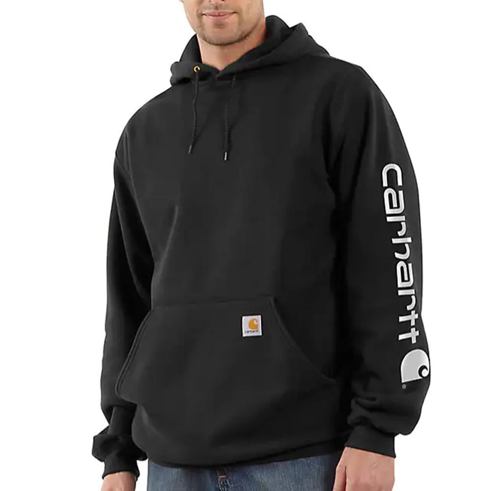 Carhartt Men's Loose Fit Midweight Logo-Sleeve Graphic Hoodie (Tall) for everyday wear. Cut the morning chill with this men's sweatshirt. A traditional cotton blend makes for versatile layering. Carhartt durability and familiar hoodie comfort mean you can strap on your tool belt or relax with equal ease. A midweight cotton blend offers everyday versatility.