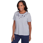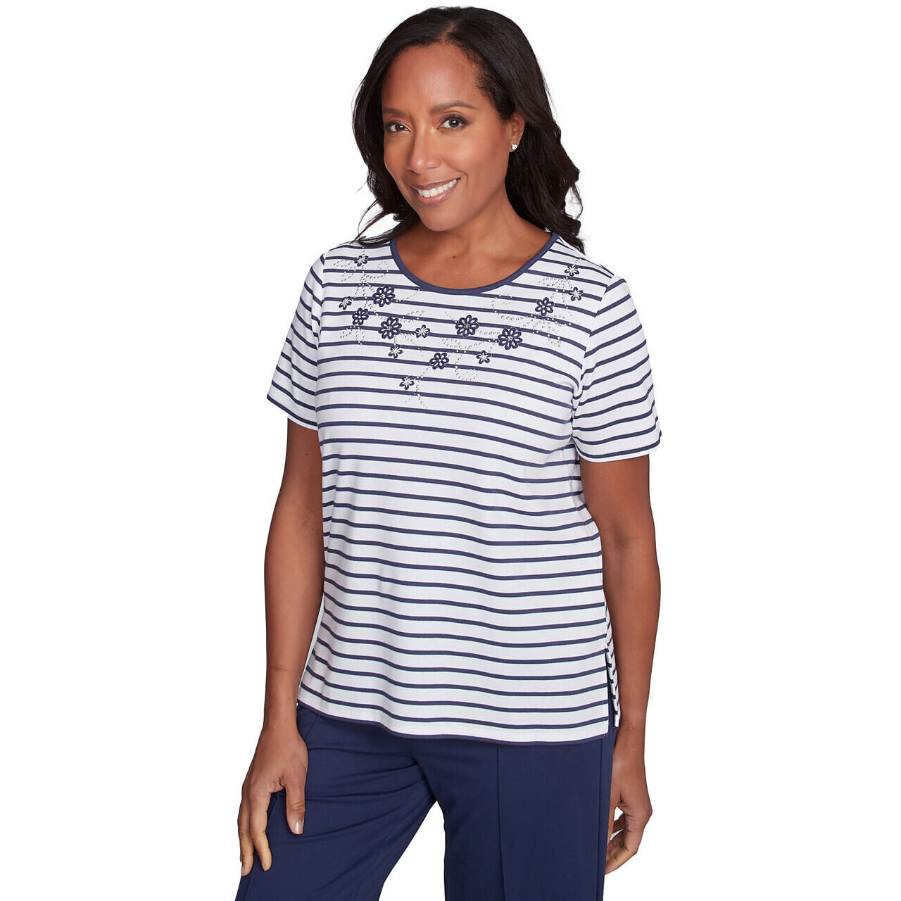 Elevate your casual wardrobe with this striped crewneck top, featuring a subtle blue trim and beaded floral accents on the neckline. With short sleeves and a straight hemline, it's the perfect blend of classic stripes and feminine detail, offering effortless style for any occasion.
