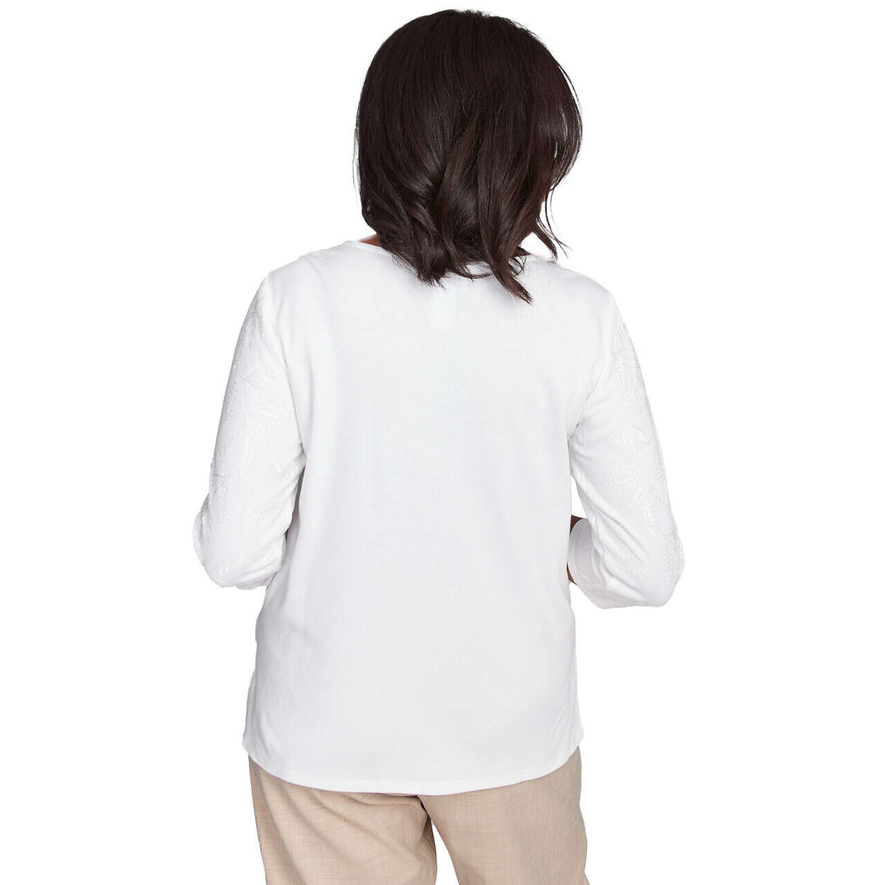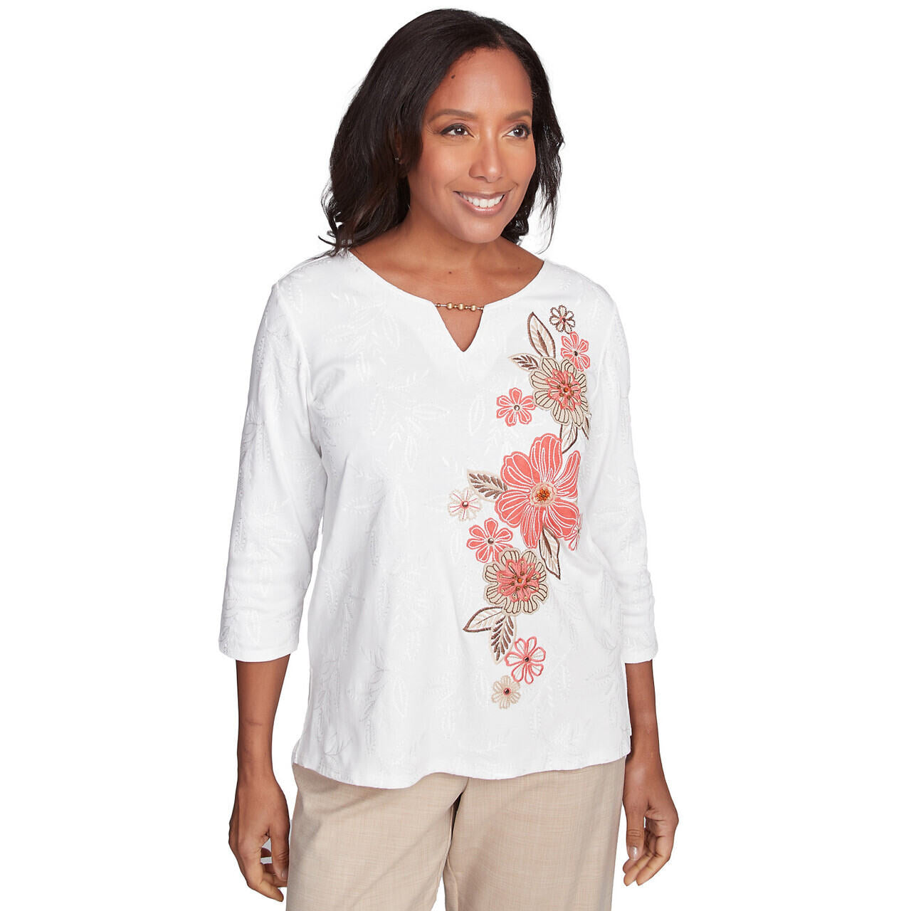 This ethereal top features a flattering split neckline that showcases the delicate floral embroidery. The three-quarter sleeves and straight hemline create a timeless silhouette. Perfect for a dreamy summer day or a romantic evening, this top is sure to make you feel beautiful.