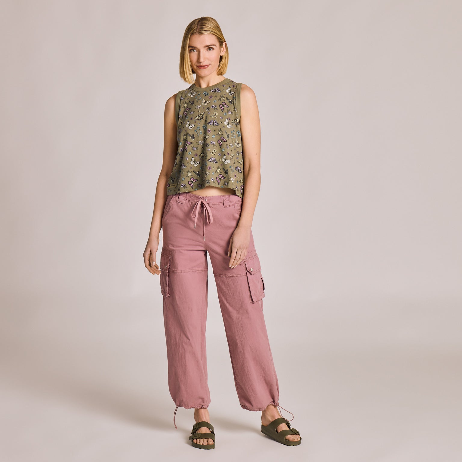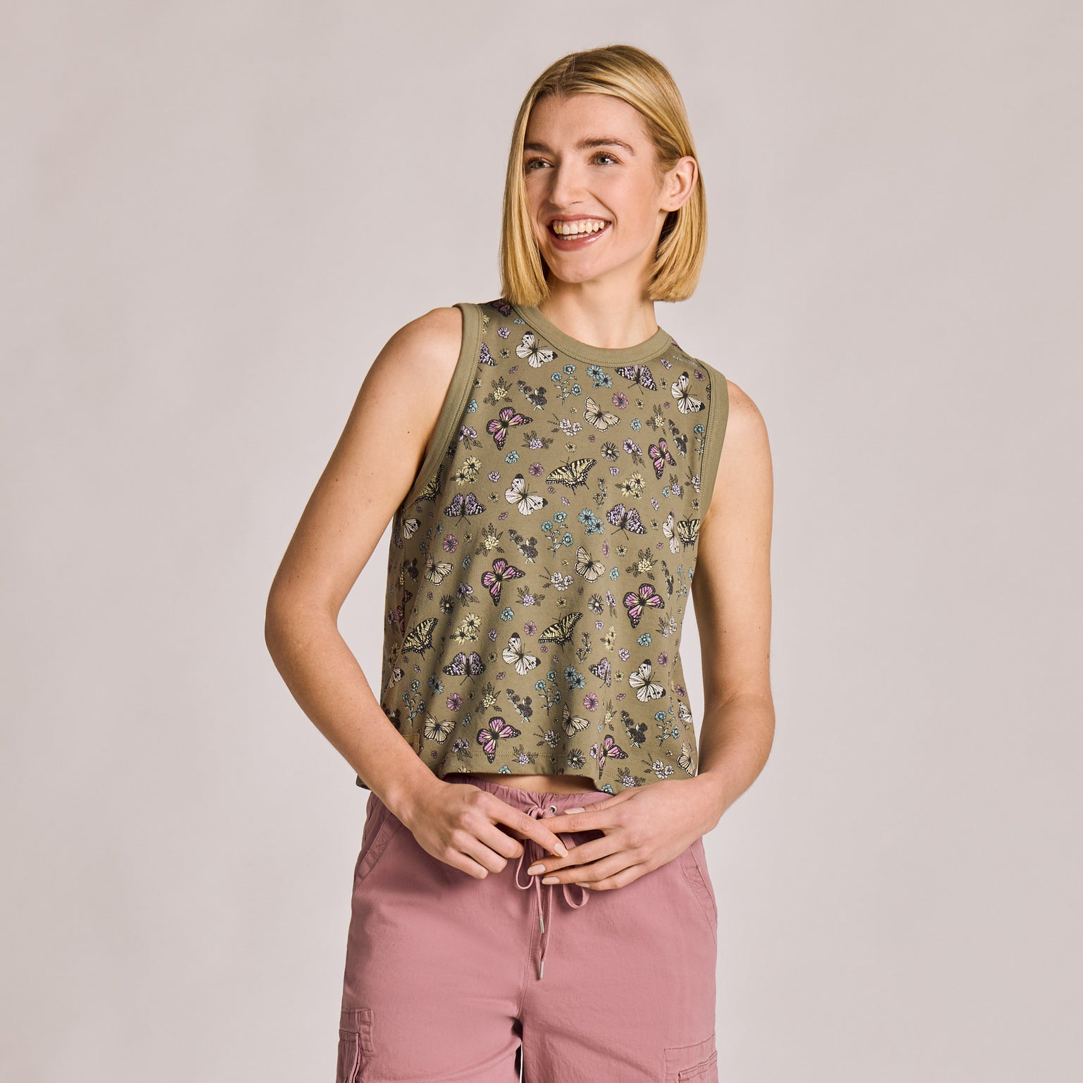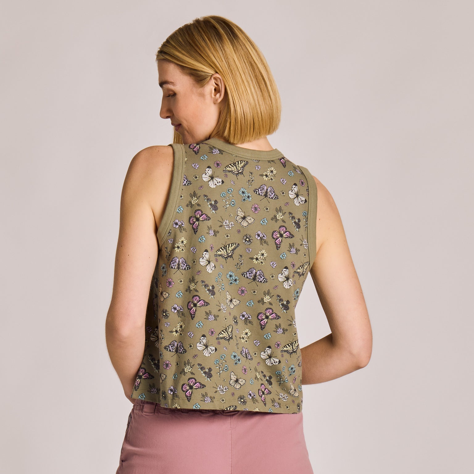 Women's Butterfly Garden Pattern Crusher Boxy Tank - Moss Green - 160534