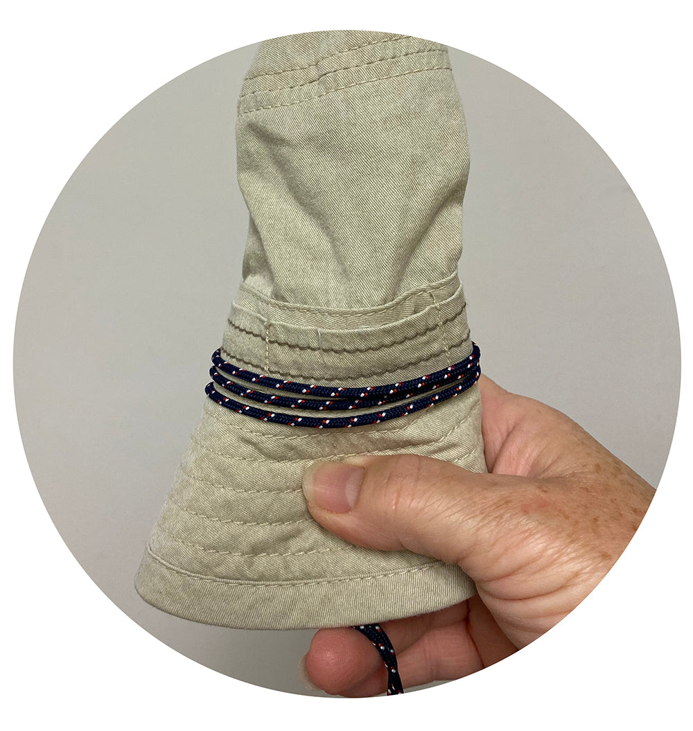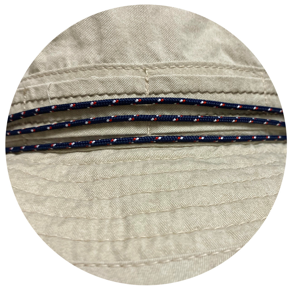 Buttery soft 100% cotton bucket hat with metal mesh eyelets. Bungee style multi- colored chin cord with adjustable toggle helps keep the hat in place. Brim measures 2 3/8”. Unstructured and packable. Unisex.