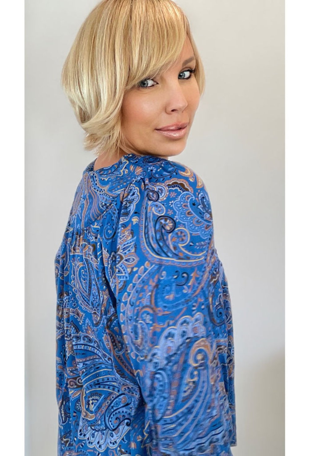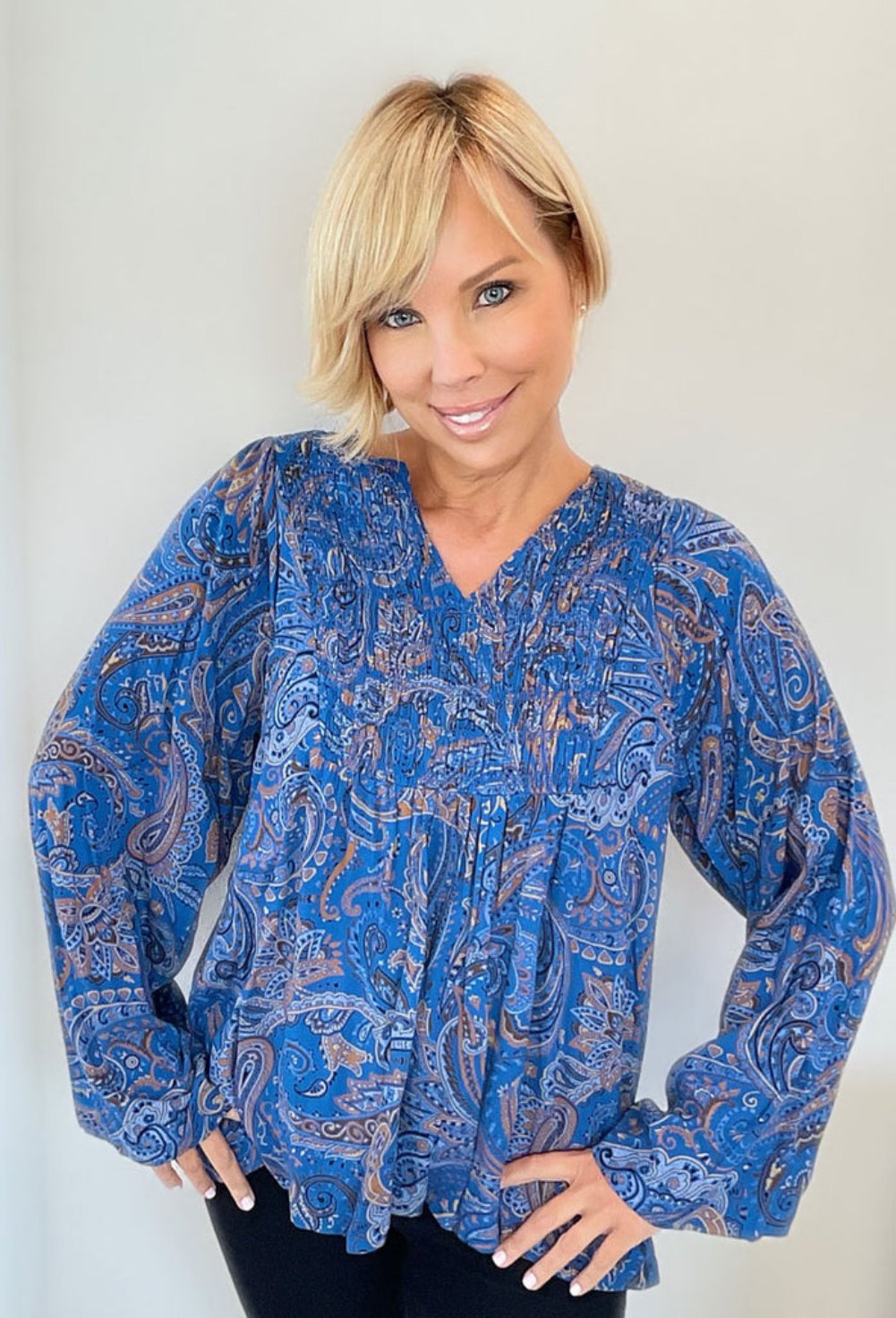 This blouse will have you asking, "where's the party?". After all who doesn't want to be seen wearing this vibrant pattern and flattering airy blouse. A warm weather, style winner.