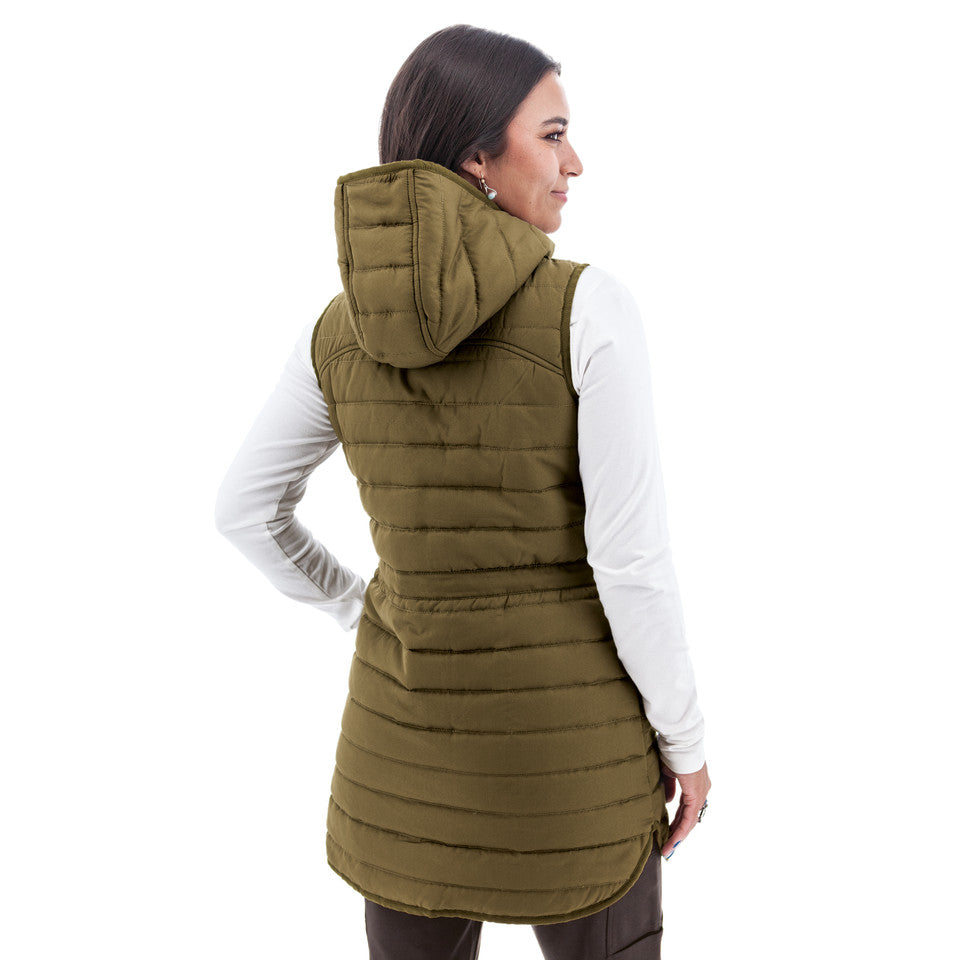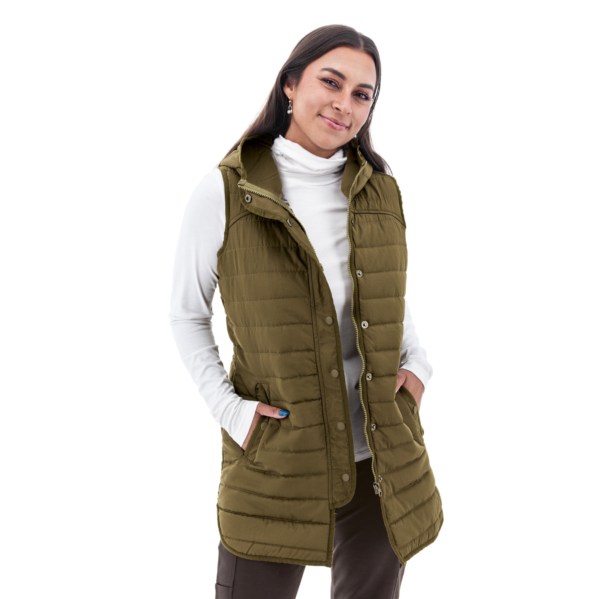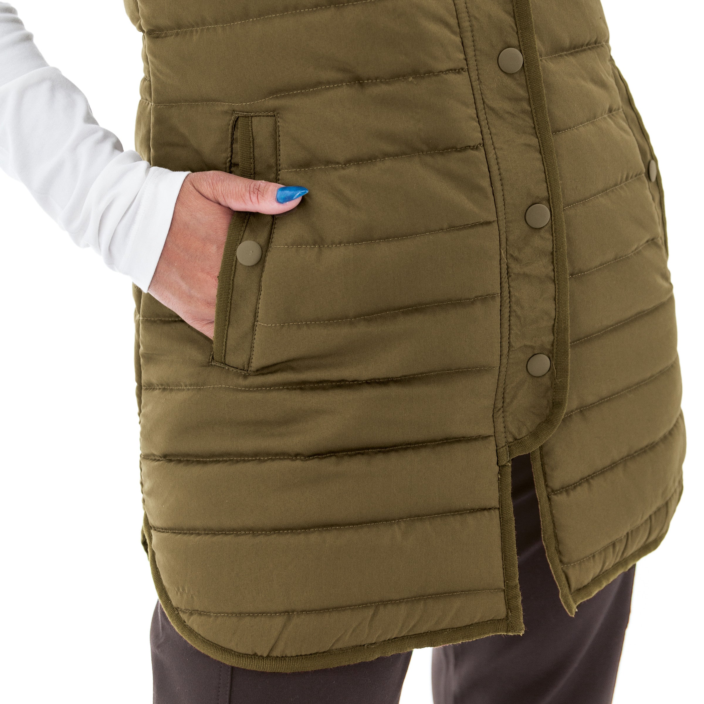 Small details make the 100% recycled polyester Fallon Long Puffer Vest shine. We love the cute printed lining and the unique look of a hooded vest. The snap closure on top of the zipper along the front is another great detail, helping keep those last wisps of cold air from seeping through. The insulated quilting pattern and PFOA-free DWR (water resistant) treated outer also adds warmth without unnecessary bulk. Even more flattering is the internal waist adjustment which adds shape to suit your unique figure. The 32" length and swooping shirttail hem make this perfect to pair with leggings along with pants.