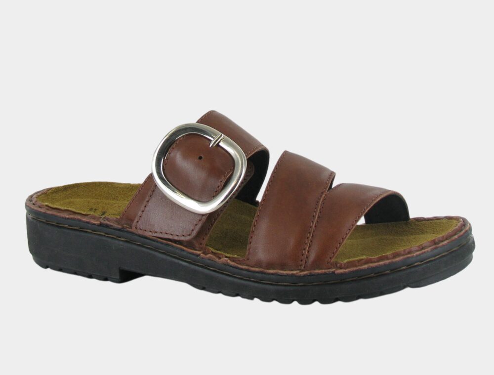 Frey is a stylish slip-on sandal with a buckle accent featuring our removable footbed for comfort. Naot's removable, anatomic cork & latex footbed is wrapped in pampering suede and molds to the shape of the foot with wear. The Low Scandinavian Collection features a 1.25" polyurethane sole which is extremely lightweight and durable.
