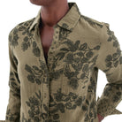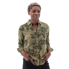 - Coordinating print detail on inside of cuffs, collar band and center front placket underside