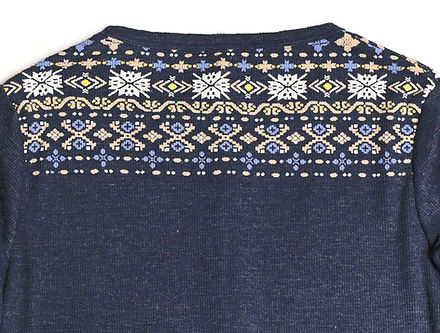 The top has a round neckline and a button-down front. The sleeves are decorated with a colorful, geometric pattern. The pattern is made up of small, repeating geometric shapes and lines, creating a repeating design. The fabric is make of a Honey Lake Waffle Henley soft and comfortable, perfect for a casual day out.