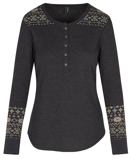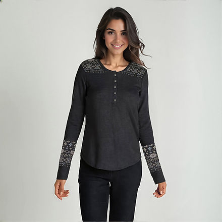 The top has a round neckline and a button-down front. The sleeves are decorated with a colorful, geometric pattern. The pattern is made up of small, repeating geometric shapes and lines, creating a repeating design. The fabric is make of a Honey Lake Waffle Henley soft and comfortable, perfect for a casual day out.