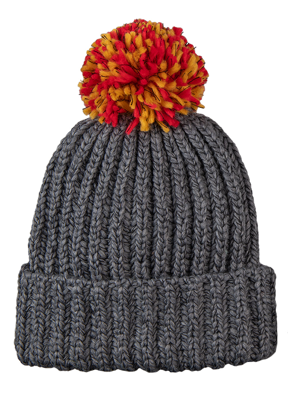Chunky rib knit cuff cap with contrast multi color pom on top. Made from heavy gauge Icelandic yarns that are 95% acrylic / 5% wool.