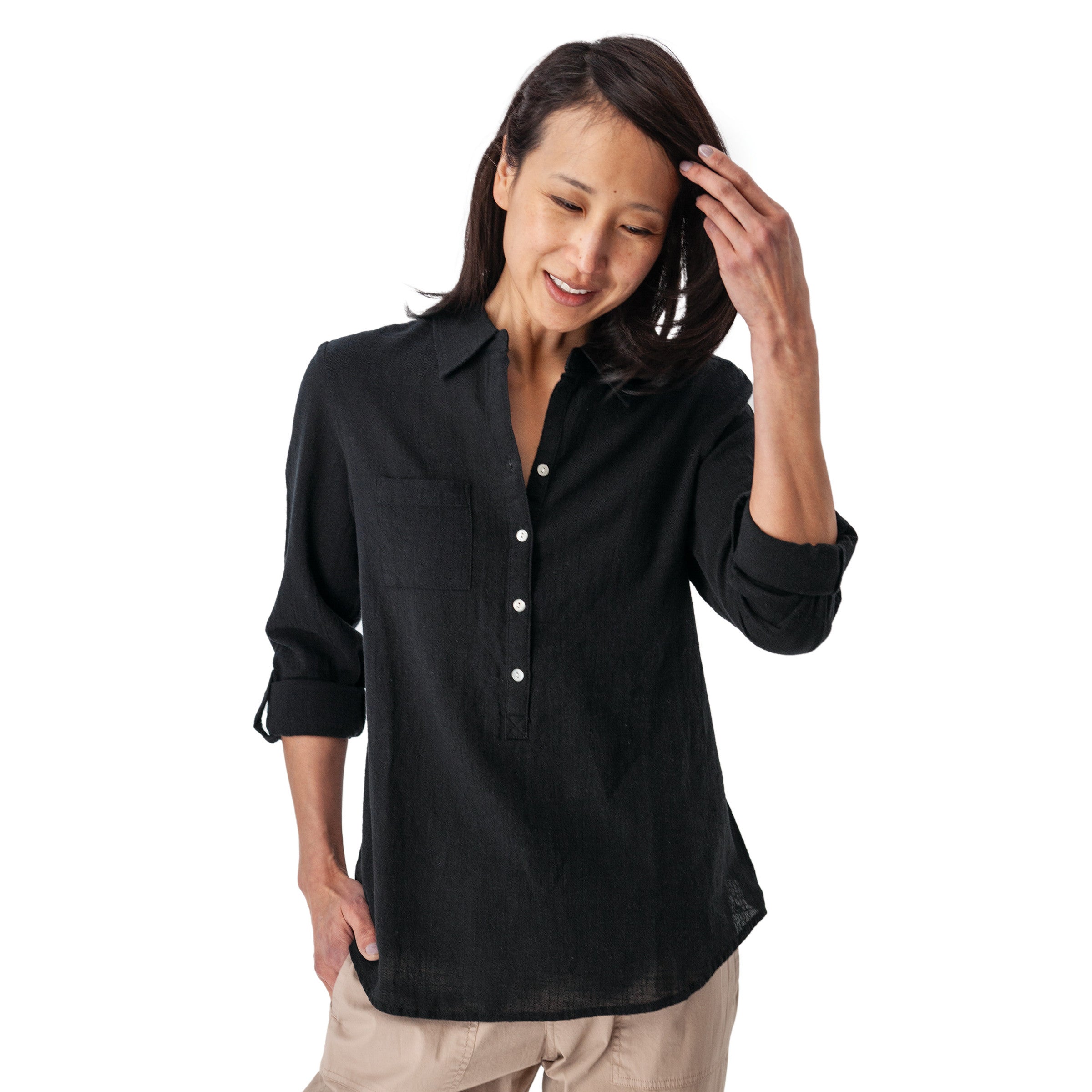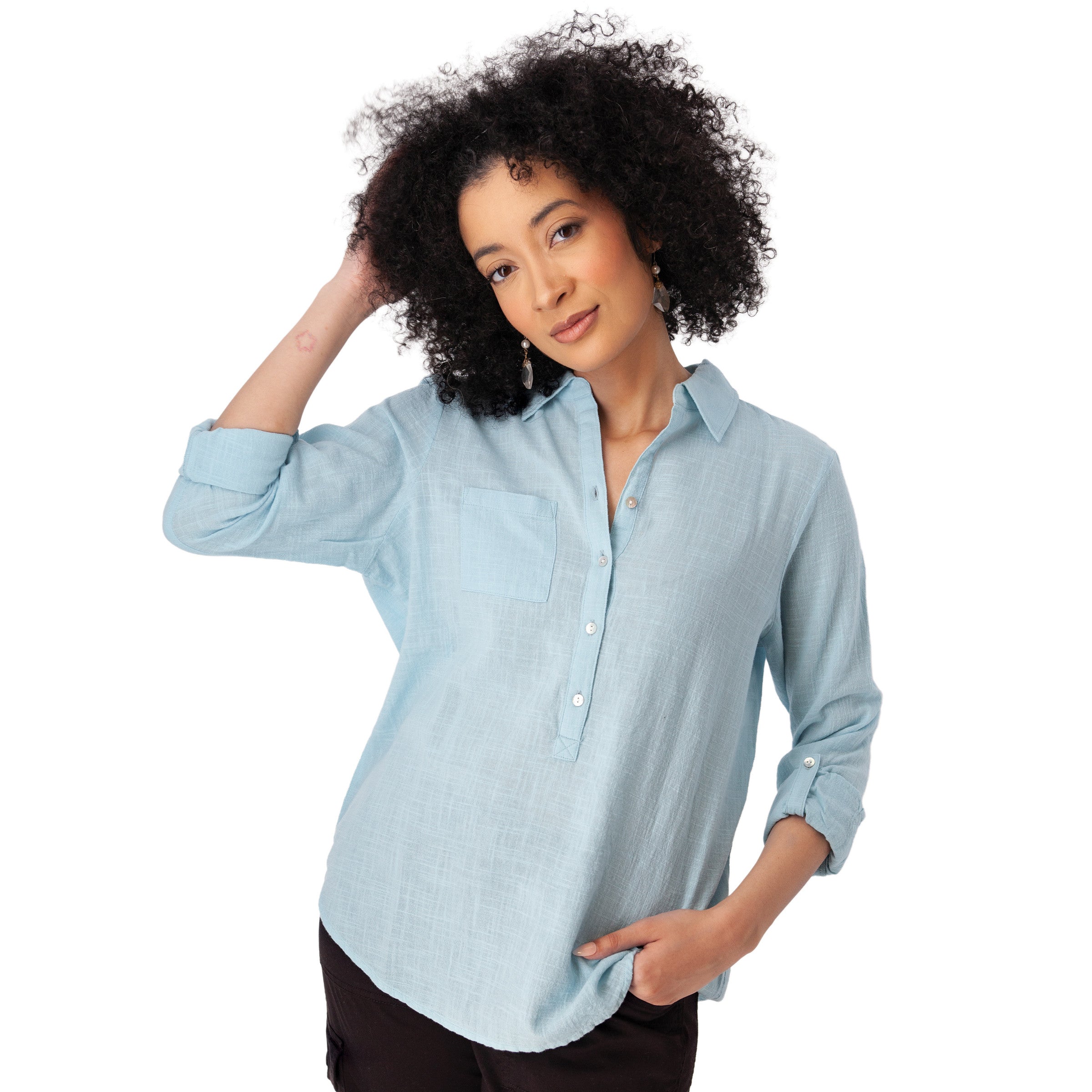 The Laken Popover Top feels like the clothing version of a deep breath-light, natural, and beautifully easy. Crafted from 100% organic cotton slub weave, it's soft to the touch with just the right amount of texture. The roll-up sleeves and relaxed shape make it your go-to for days that call for comfort without compromise.
