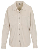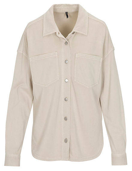The collar is buttoned up and the shirt appears to be made of Plymouth French Terry Overshirt a lightweight fabric. The overall style of the shirt is casual and relaxed.