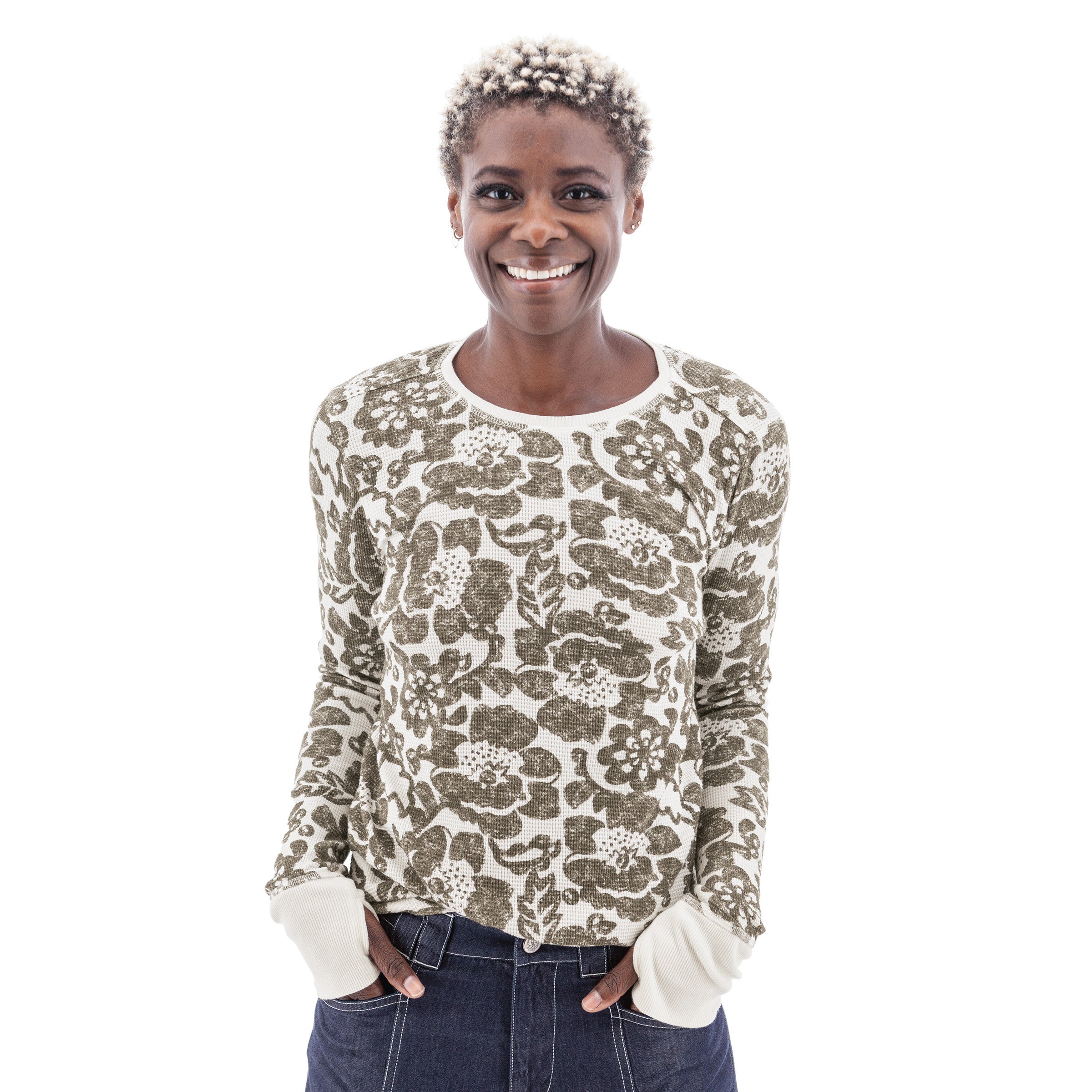 What's better than a thermal top that keeps you warm and comfy? One that also happens to be adorable. Picture this: a soft floral waffle knit, cozy thumbholes, and details that make you say, wait, where has this been all my life? Yep, it's the Sylvan Floral Thermal Top-equal parts functional and fun.
