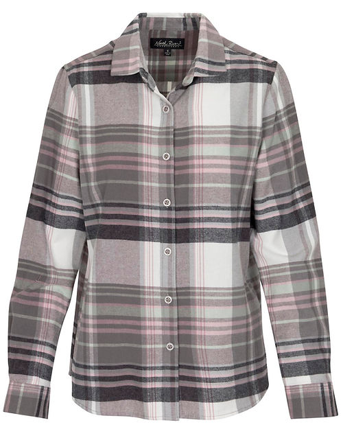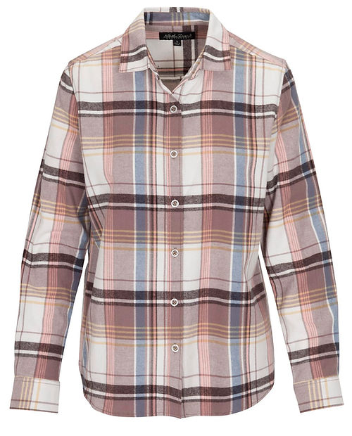 Women's long-sleeved Timberline Flannel button-down shirt. a plaid fabric in shades of pink, blue and beige. the shirt made of cotton.