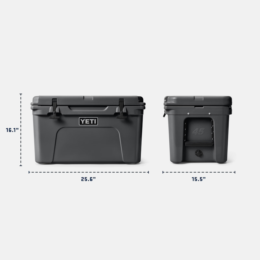 A SOLID ALL-PURPOSE SIZE. HOLDS OVERNIGHT CAMP PROVISIONS FOR FOUR PEOPLE OR DRINKS FOR A DAY ON THE WATER. The Tundra® 45 Cooler combines versatility with durability. This premium cooler is infused with that legendary YETI toughness — a durable rotomolded construction — and up to three inches of PermaFrost™ Insulation. Which is to say it's built to last and will keep your contents ice-cold even in sweltering conditions, or keep your campfire food warm despite the wind chill.