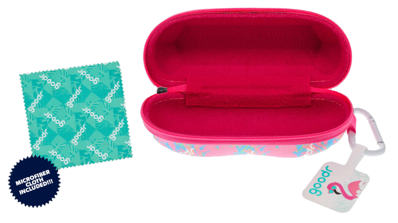 Your shades keep your eyes safe, so show them some love! We Make a Good Case is a hard sunglasses case with a super-soft lining to keep your shades safe and sound. This lightweight zipper-enclosed protective case has a slim profile and a stylish vibrant pink tropical print. Plus it comes with a bonus microfiber cleaning cloth and carabiner for easy carry.