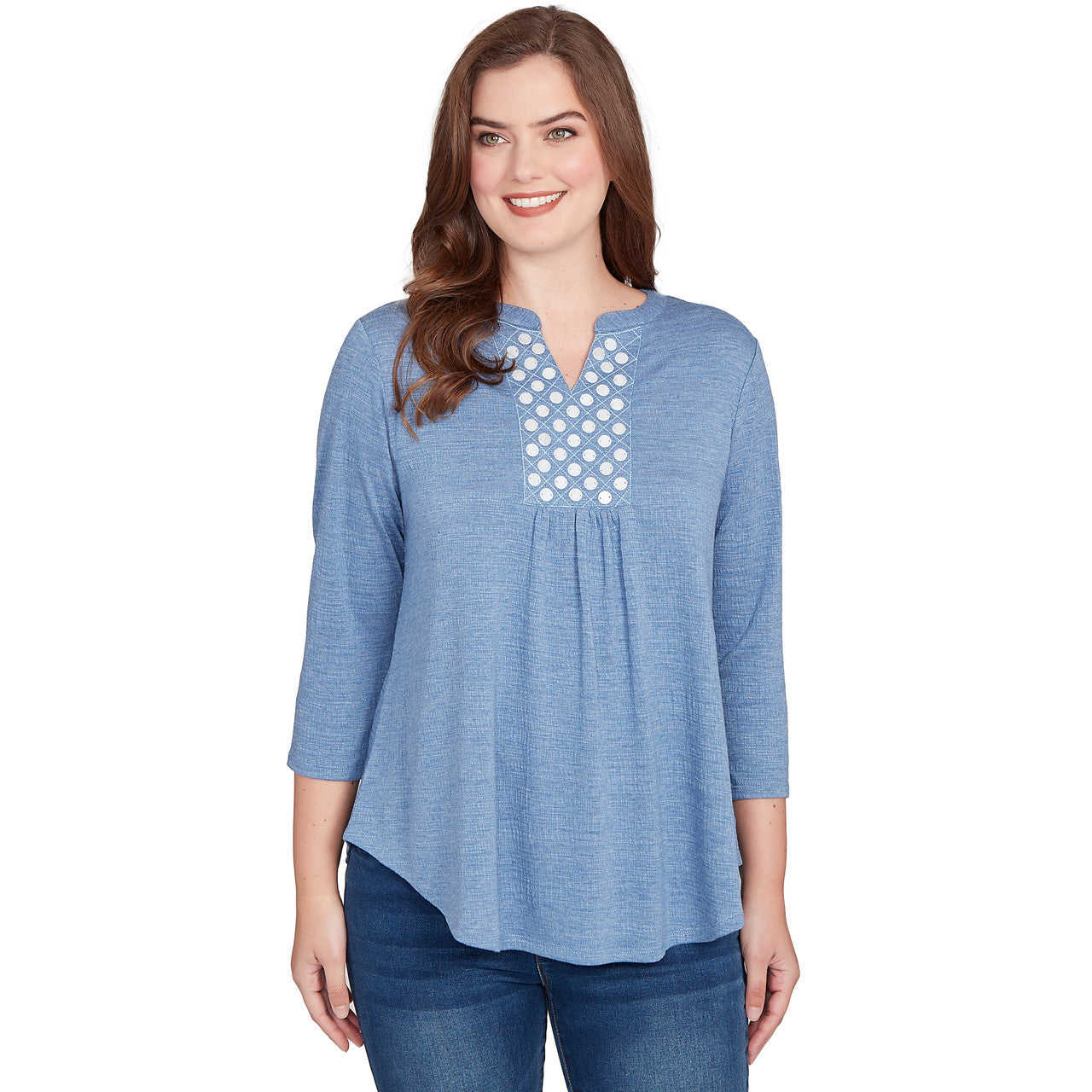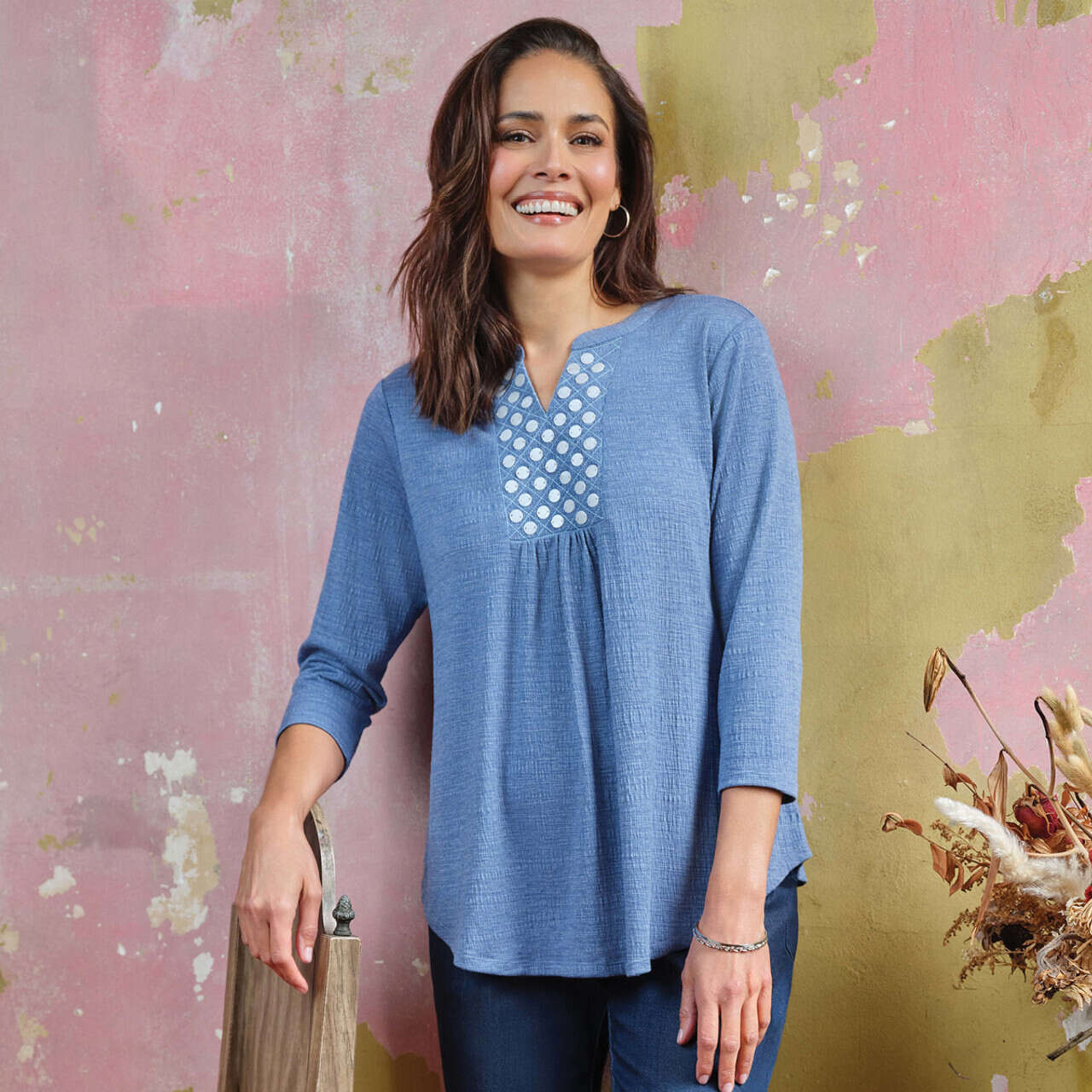 This top is crafted from a cozy solid heather textural knit that's comfortable and adds subtle visual interest. It features 3/4 length sleeves and the neckline is beautifully adorned with intricate stitch details and unique shell beading, giving it an artisan touch. With a flattering V-neck and comfortable fit, it's an easy way to add a little something special to your casual style.