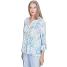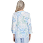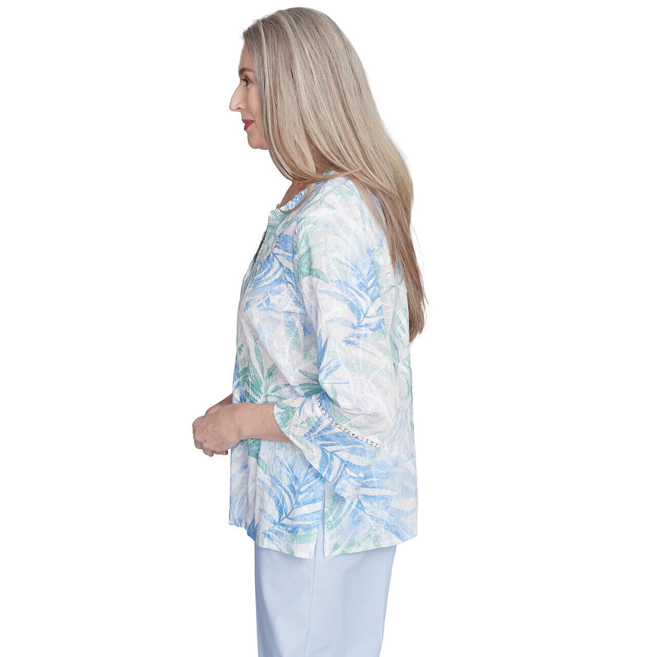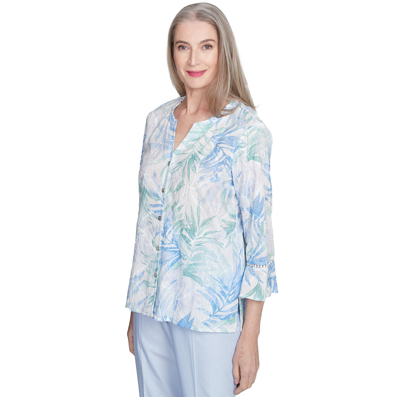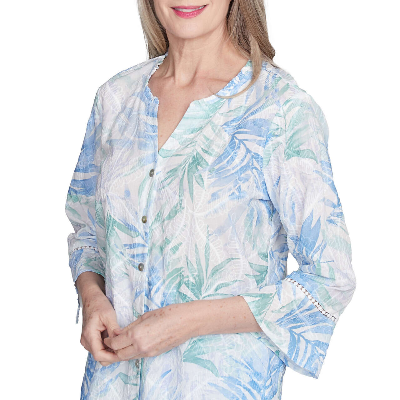 Bring a breezy, island-inspired vibe to your wardrobe with this embroidered tropical button front top. Featuring delicate tropical embroidery and a playful ruffled collar, it's designed to stand out. The three-quarter eyelet embellished bell sleeves add a hint of drama, while the straight hem and button-down front offer a relaxed yet polished look.