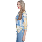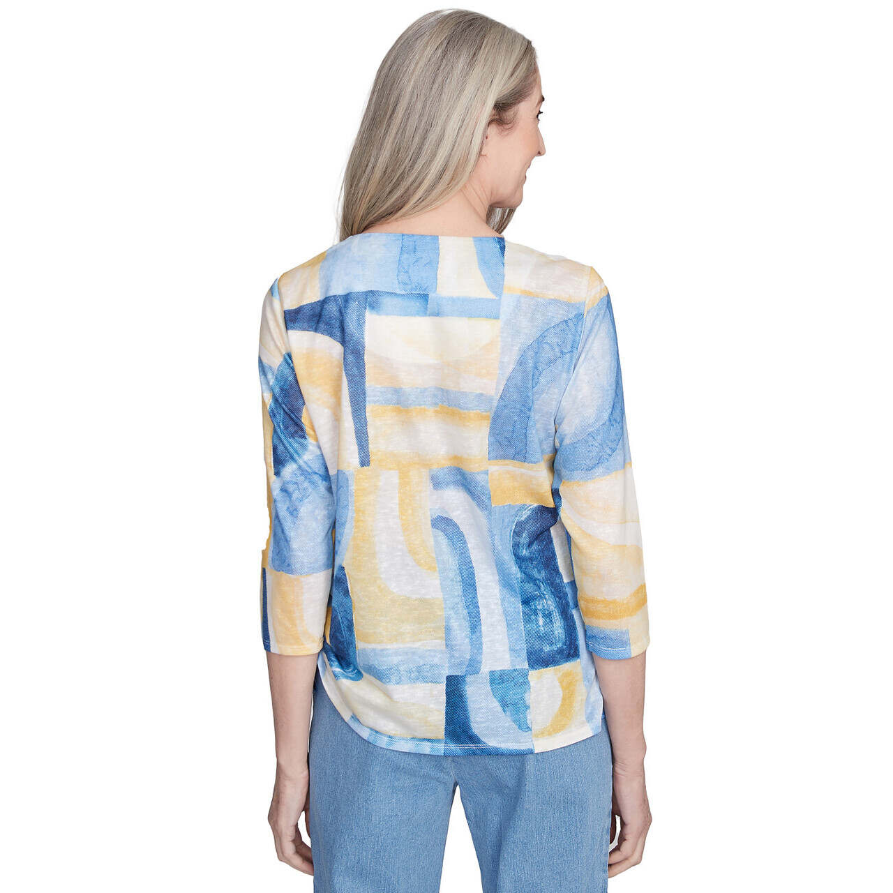 This top is a true work of art, featuring a watercolor patchwork design that brings a splash of color and creativity to your wardrobe. The split beaded neckline adds a hint of sparkle, while side ruching with a tie closure gives a flattering, adjustable fit with a playful twist. Finished with three-quarter sleeves, this top is perfect for expressing your unique style with a blend of artful details and effortless elegance.